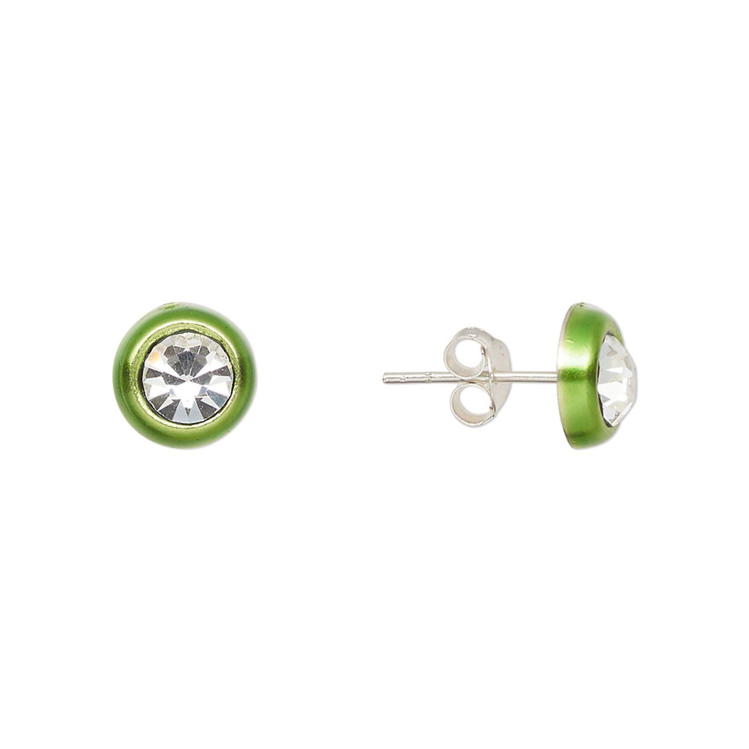 Earstud, Create Compliments®, enamel and sterling silver, peridot green, 8mm round. Sold per pair.