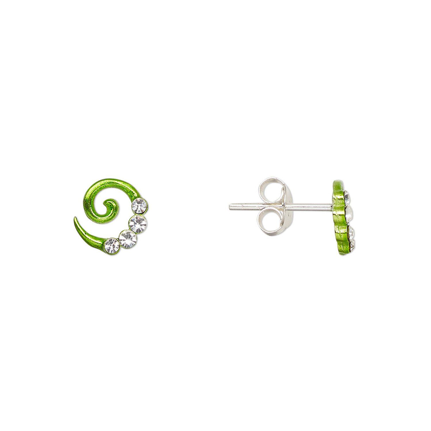 Earstud, Create Compliments®, enamel and sterling silver, green, 7mm swirl. Sold per pair.