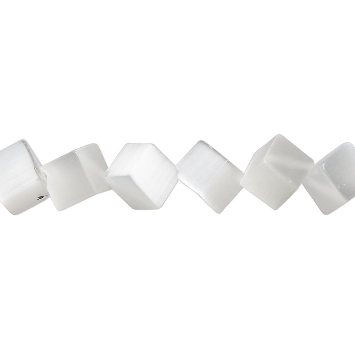 Bead, cat's eye glass (fiber optic glass), white, 9mm diagonally drilled cube. Sold per 15-inch strand.