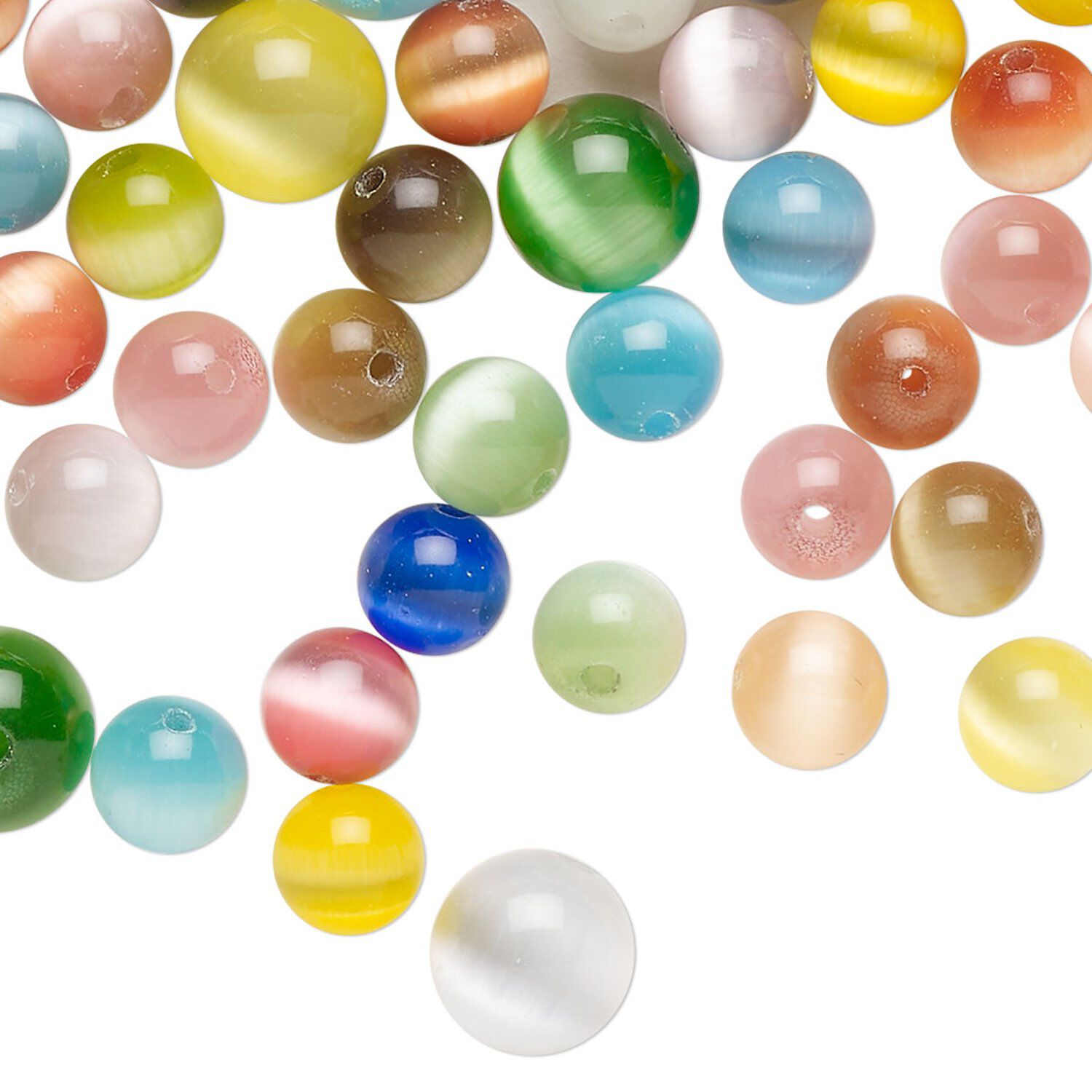 Bead mix, cat's eye glass (fiber optic glass), opaque mixed colors, 6-10mm round. Sold per 2-ounce pkg, approximately 140 beads.