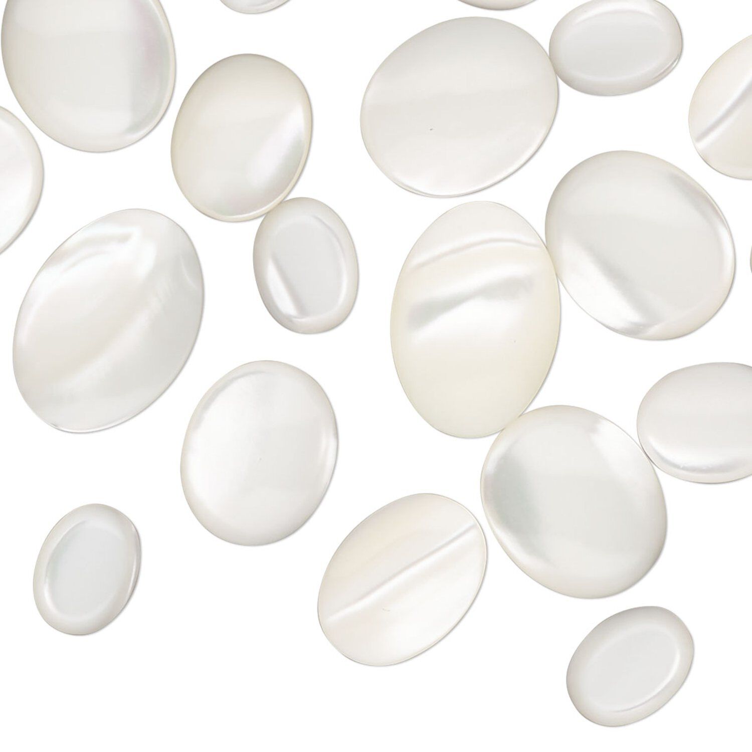 Cabochon, mother-of-pearl shell (bleached), 8x6mm-14x10mm non-calibrated oval, Mohs hardness 3-1/2. Sold per pkg of 20.