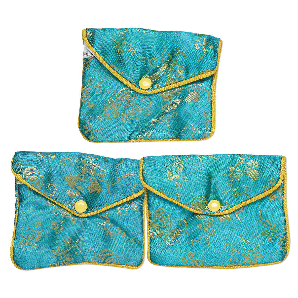 Pouch, rayon, teal / yellow / white, 3-1/2x4-1/2-inch brocade. Sold per pkg of 3.