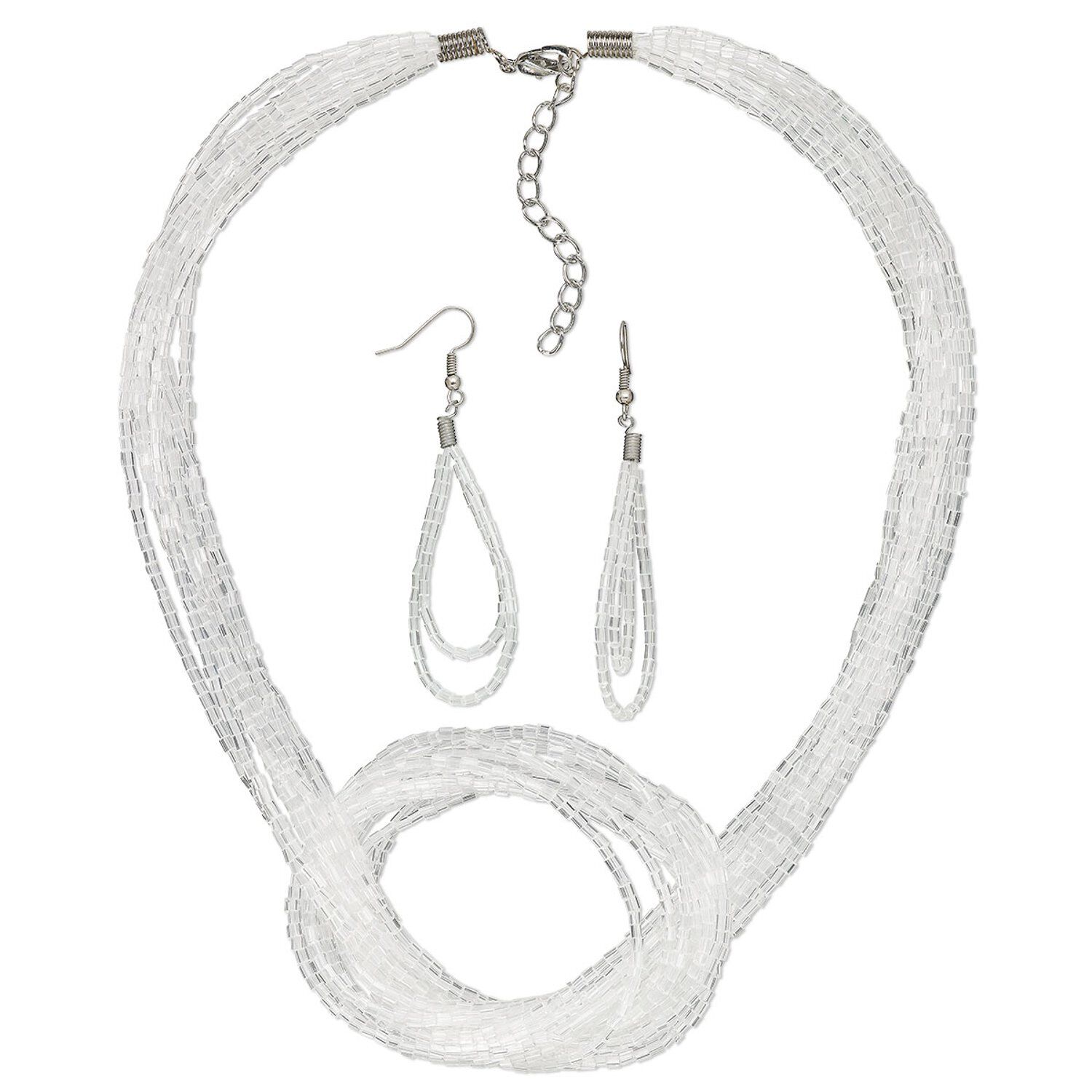 Necklace and earring set, Everyday Jewelry, imitation rhodium-plated-steel and glass, clear, 16-inches with 2-inch extender chain, 3-inch earrings with fishhook ear wires, 19 gauge. Sold per set.