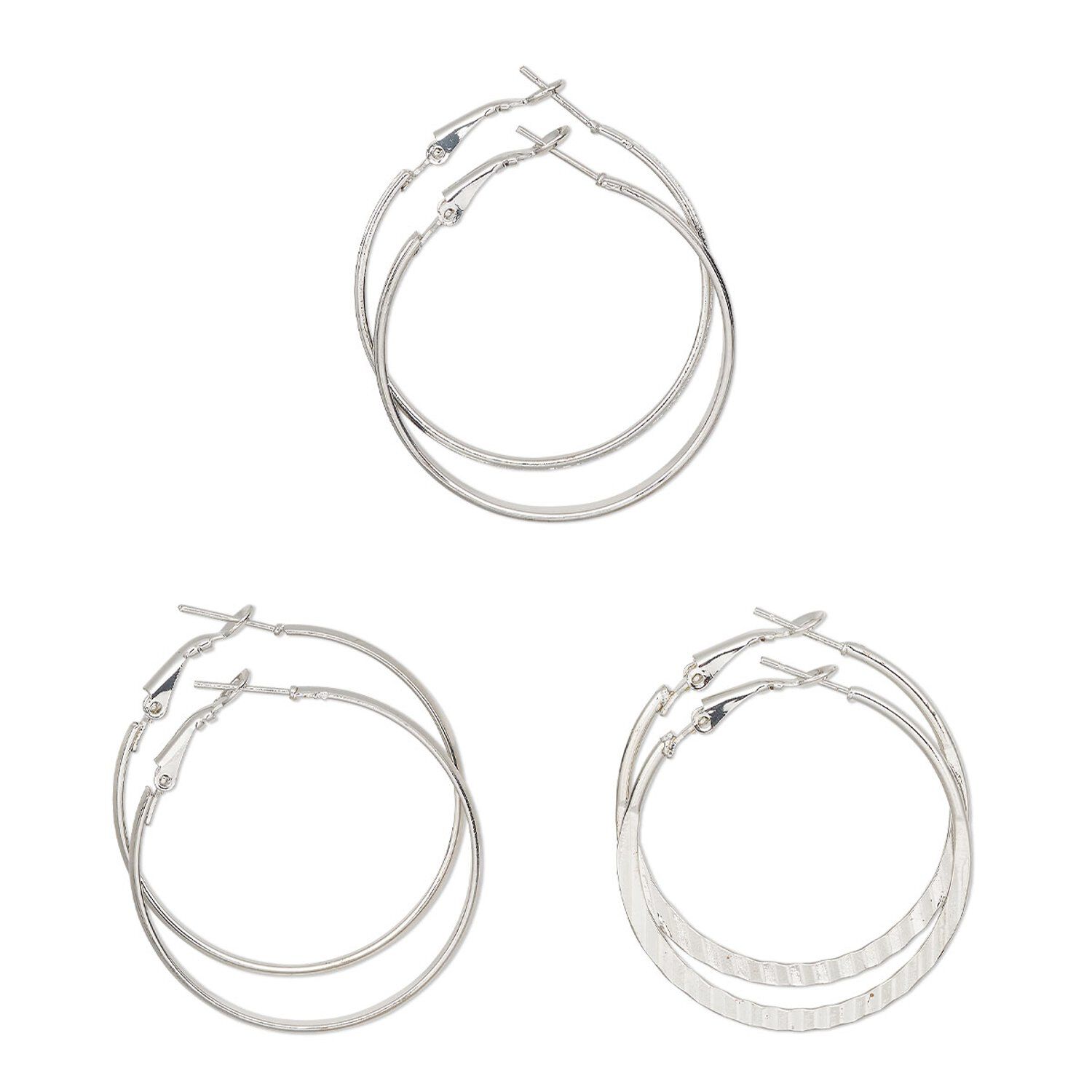Earring, Everyday Jewelry, nickel-finished steel, 40mm hoop with smooth / textured / faceted designs, latch-back closure. Sold per pkg of 3 pairs.