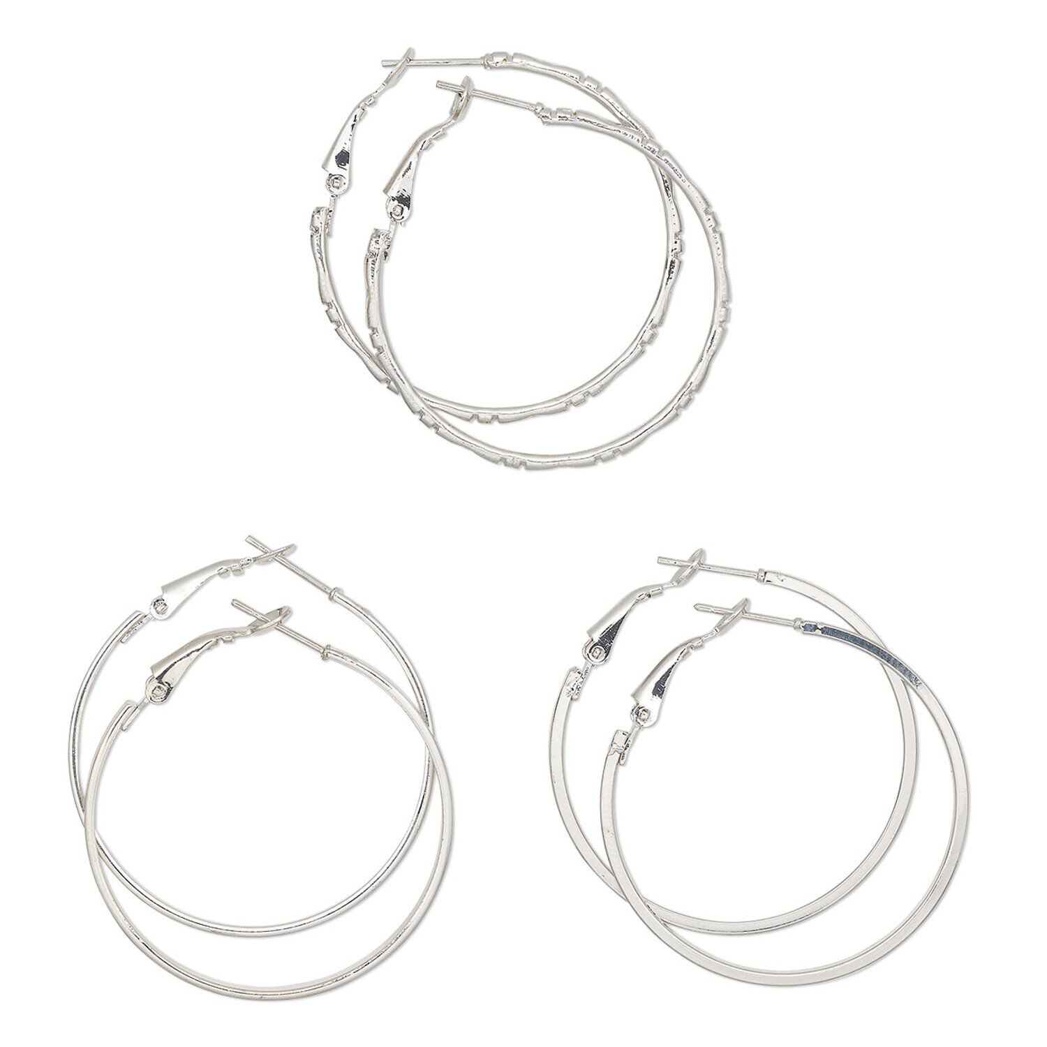 Earring, Everyday Jewelry, nickel-finished steel, 40mm hoop with smooth and textured designs, latch-back closure. Sold per pkg of 3 pairs.