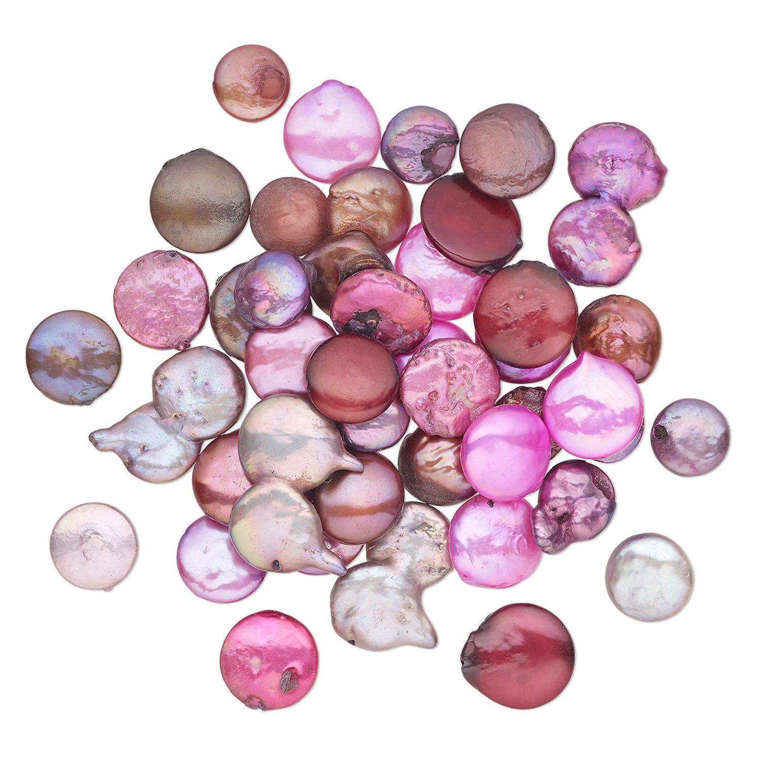 Pearl, cultured freshwater pearl (dyed), mixed colors, 11-16mm flat round, Mohs hardness 2-1/2 to 4. Sold per 2-ounce pkg, approximately 42 beads.