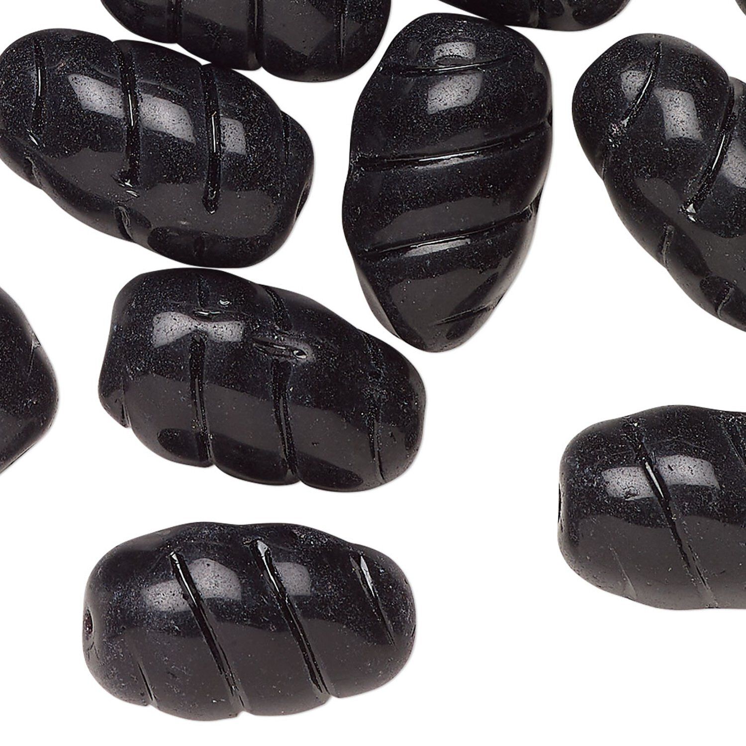 Bead, Czech pressed glass, opaque black, 20x11mm grooved oval. Sold per 2-ounce pkg, approximately 15 beads.