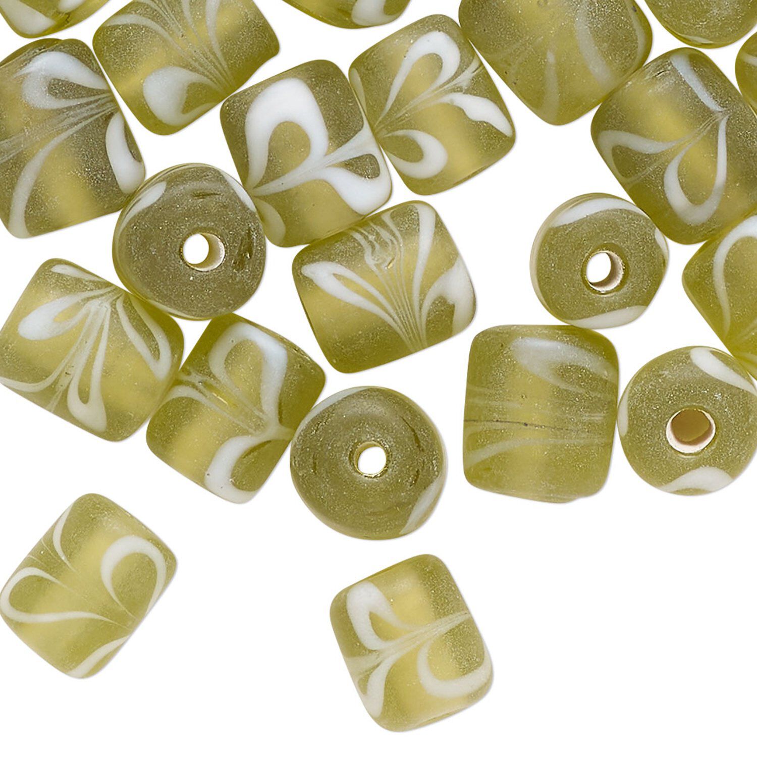 Bead, lampworked glass, translucent yellow-green and white, 9x7mm-10x8mm round tube with swirl design. Sold per pkg of 40 beads.