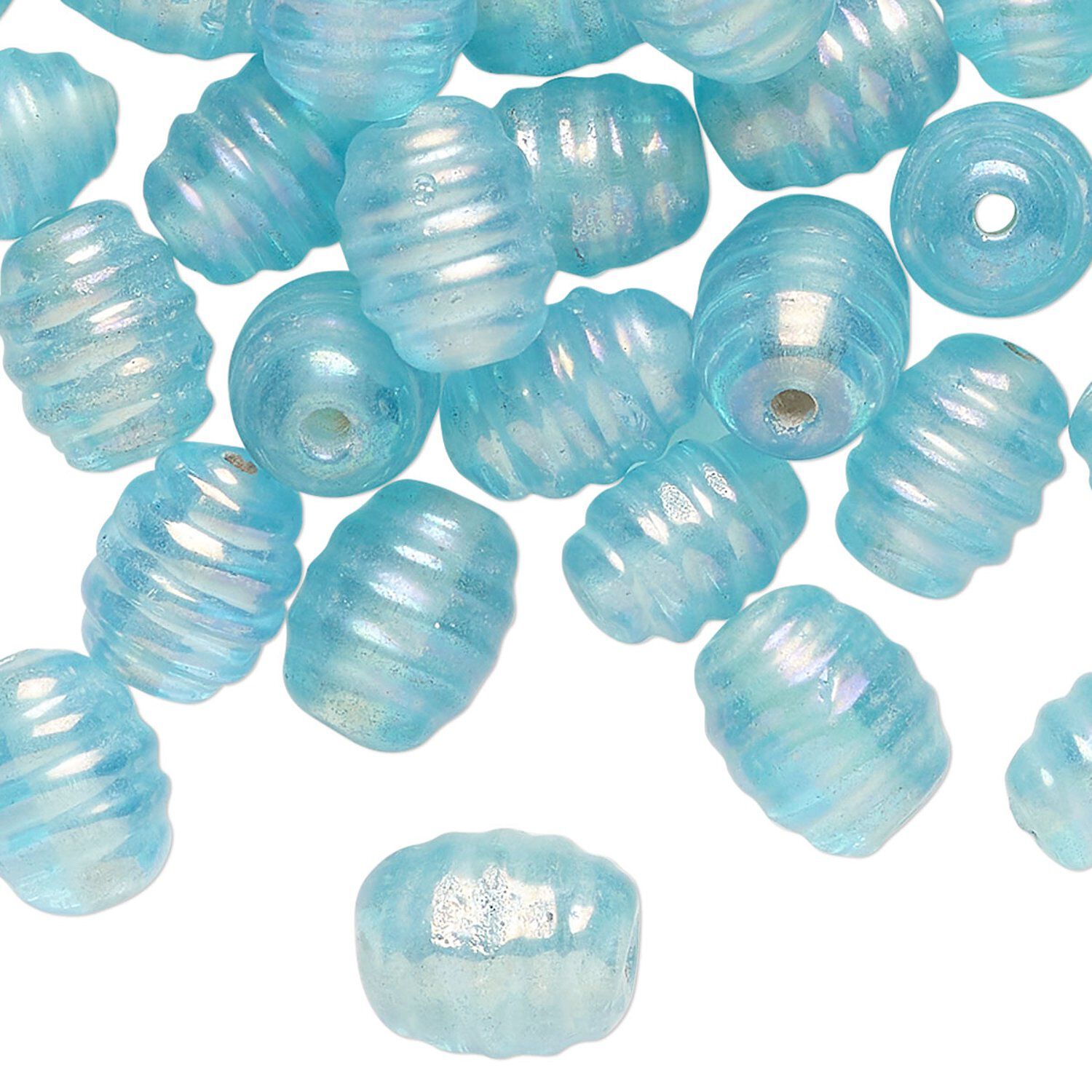 Bead, iridescent glass, translucent light aqua blue, 11x9mm ribbed oval. Sold per pkg of 50 beads.