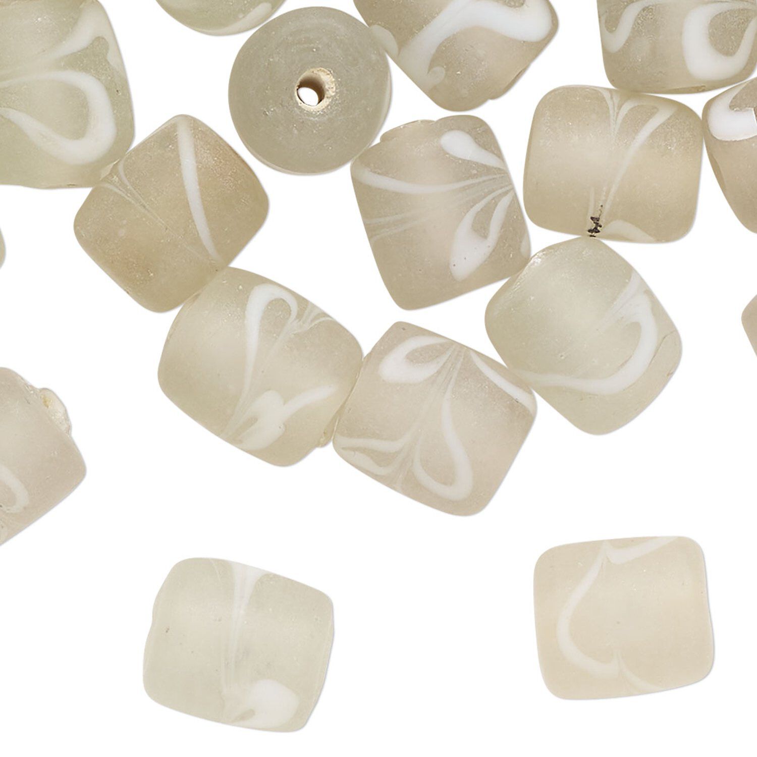 Bead, glass, translucent frosted clear and white, 10x8mm-11x9mm round tube swirl design. Sold per pkg of 40 beads.