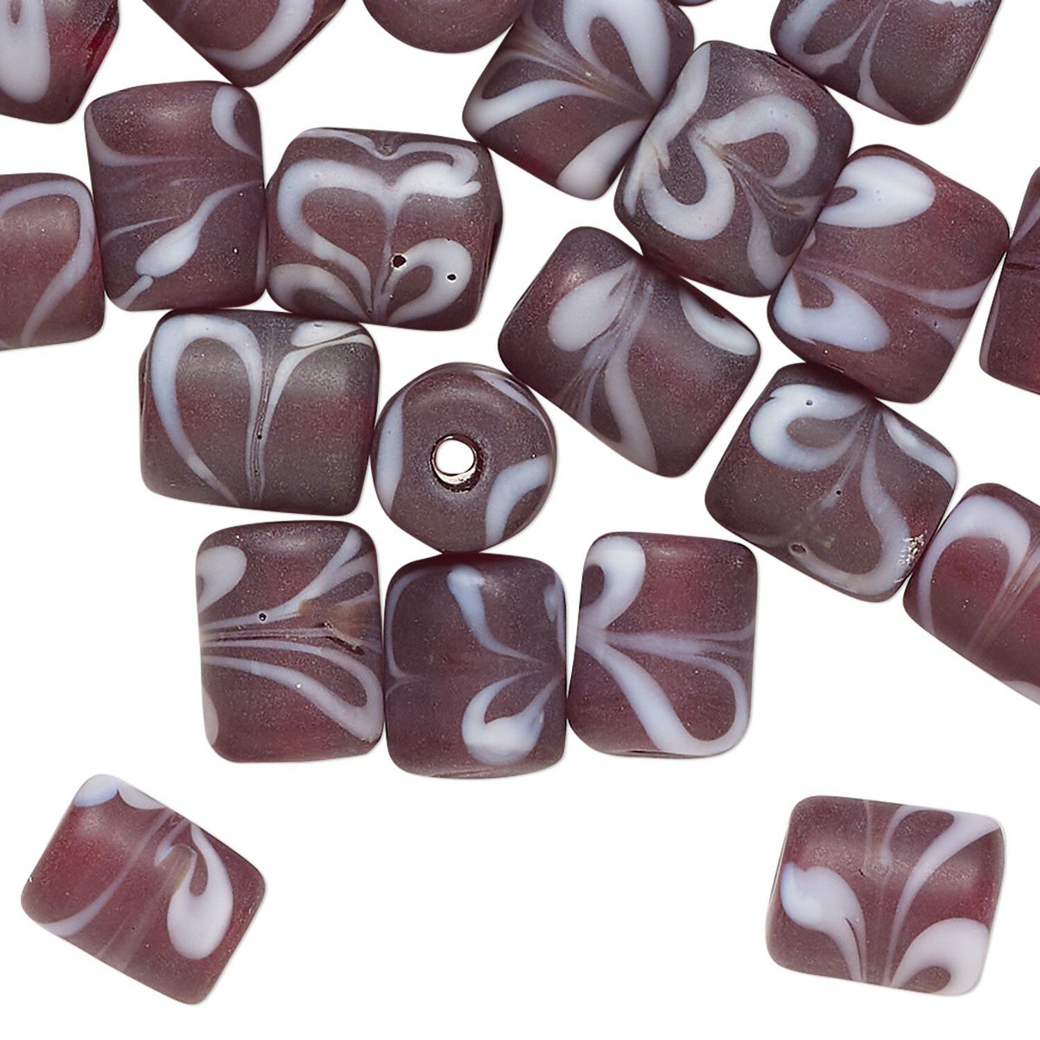 Bead, frosted glass, translucent frosted purple-bronze and white, 10x8mm-11x9mm round tube with swirl design. Sold per pkg of 40 beads.