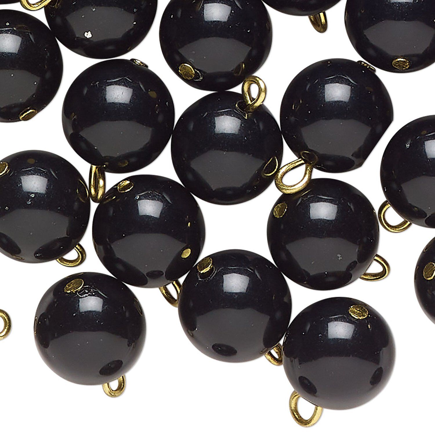 Drop, acrylic, black pearl, gold-finished brass, 12mm round. Sold per pkg of 100.