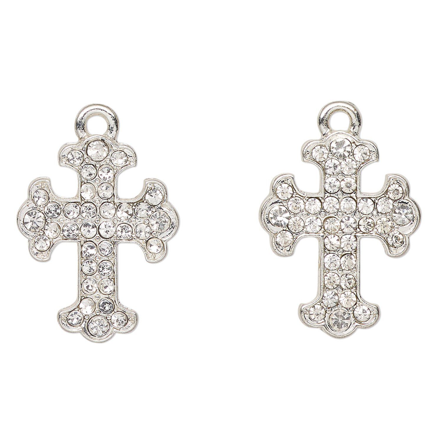 Drop, antique silver-finished "pewter" (zinc-based alloy) and glass, clear, 22x17mm cross. Sold per pkg of 2.
