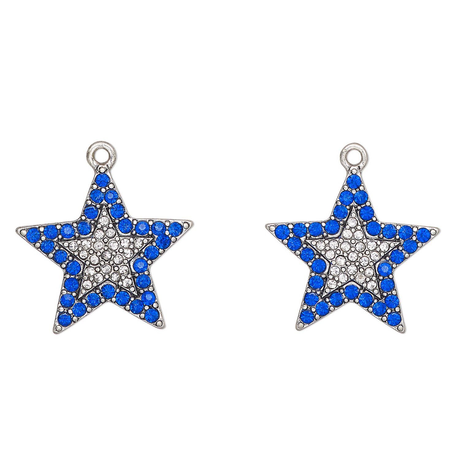 Charm, antique silver finish "pewter" (zinc-based alloy) and glass, blue and clear, 25x24mm star. Sold per pkg of 2.