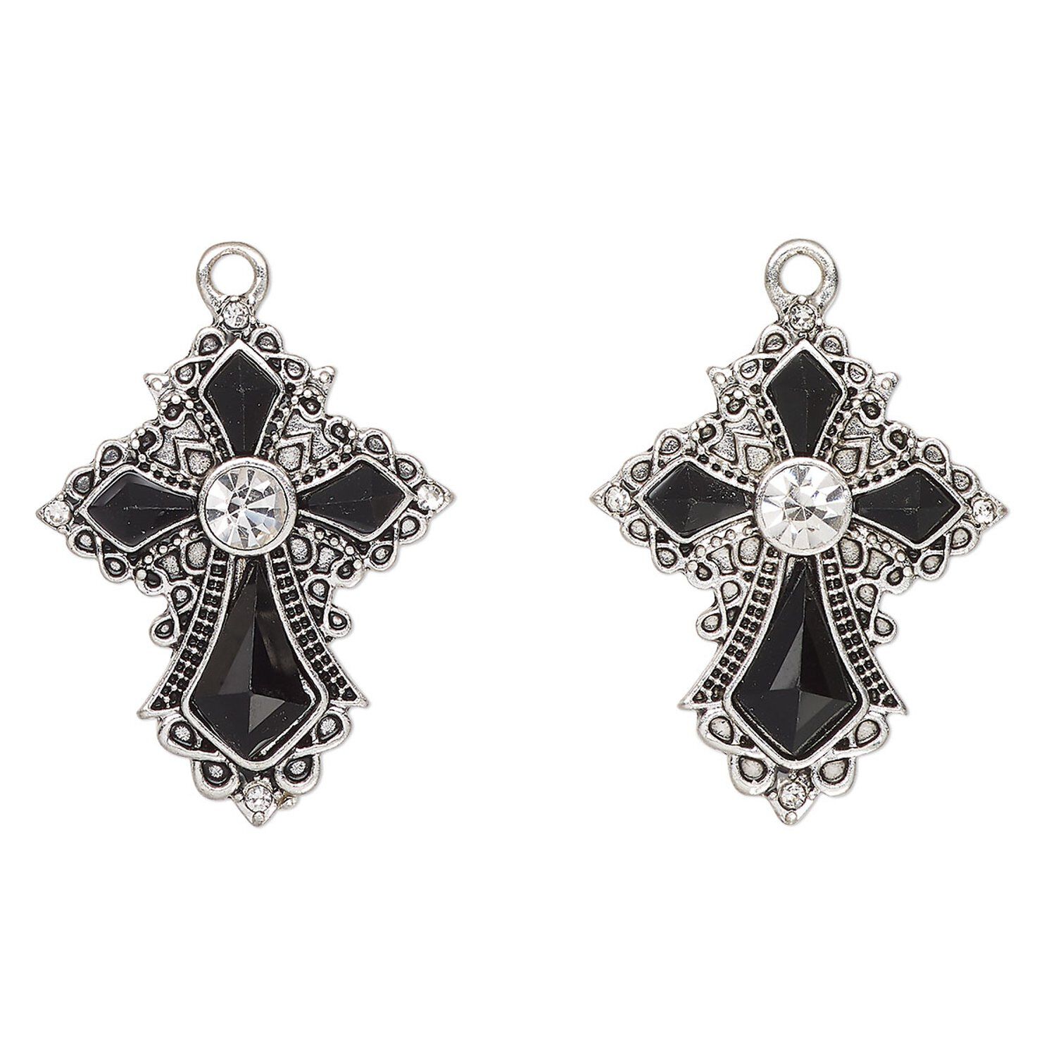 Drop, antique silver-finished "pewter" (zinc-based alloy) and glass, clear and black, 29x23mm fancy cross. Sold per pkg of 2.