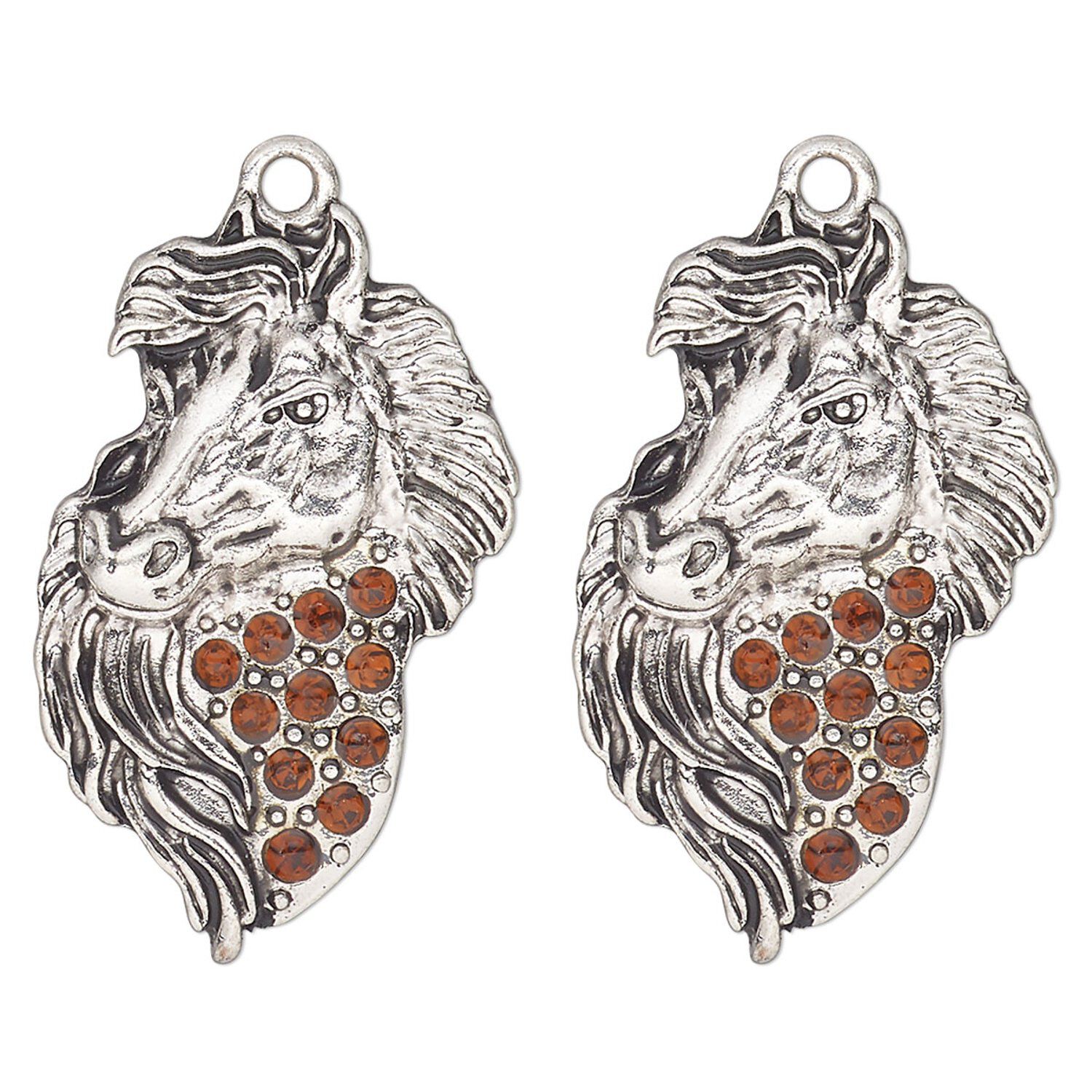 Focal, antique silver-finished "pewter" (zinc-based alloy) and glass, brown, 31x19mm single-sided horse head. Sold per pkg of 2.
