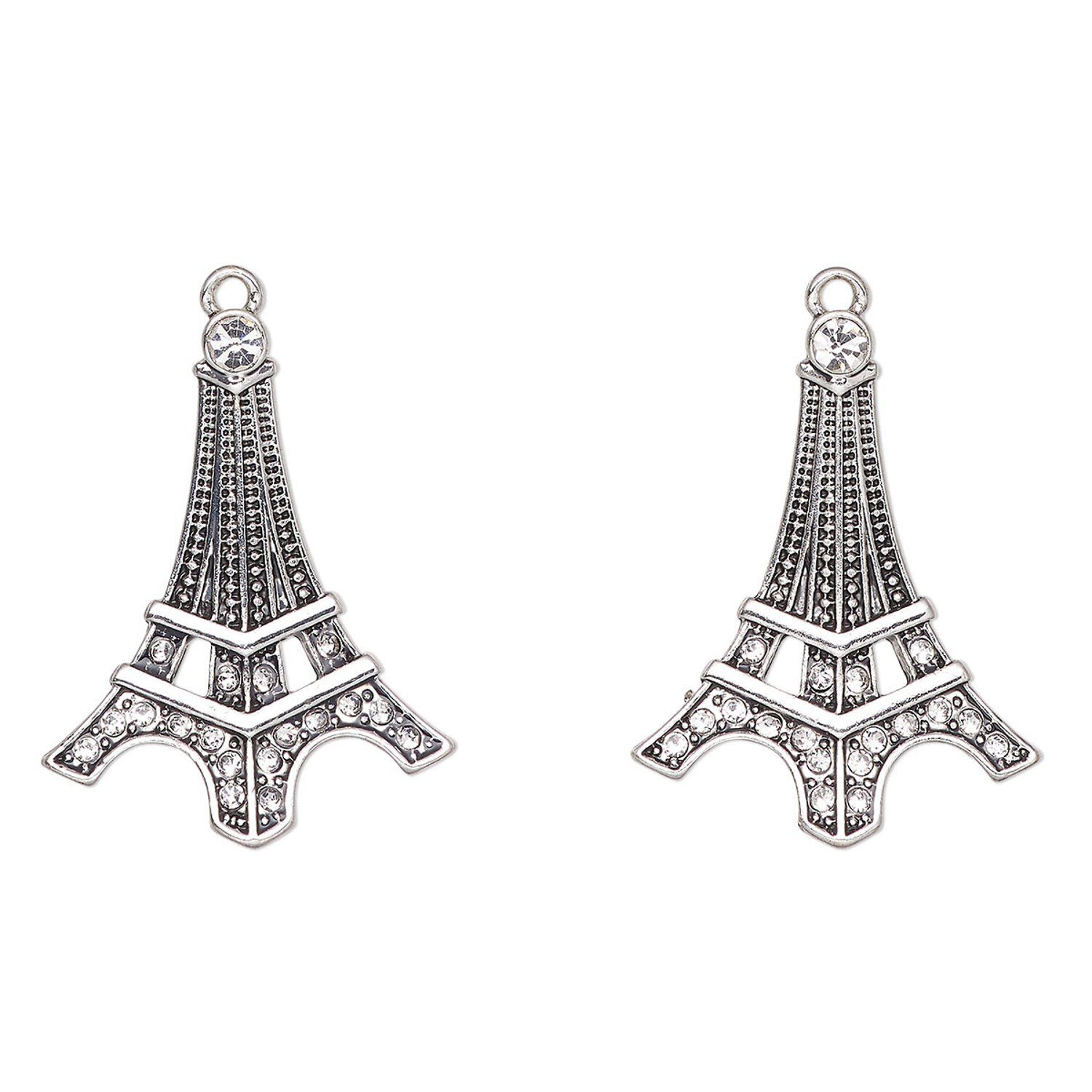 Focal, antique silver-finished "pewter" (zinc-based alloy) and glass, clear, 34x26mm Eiffel tower. Sold per pkg of 2.