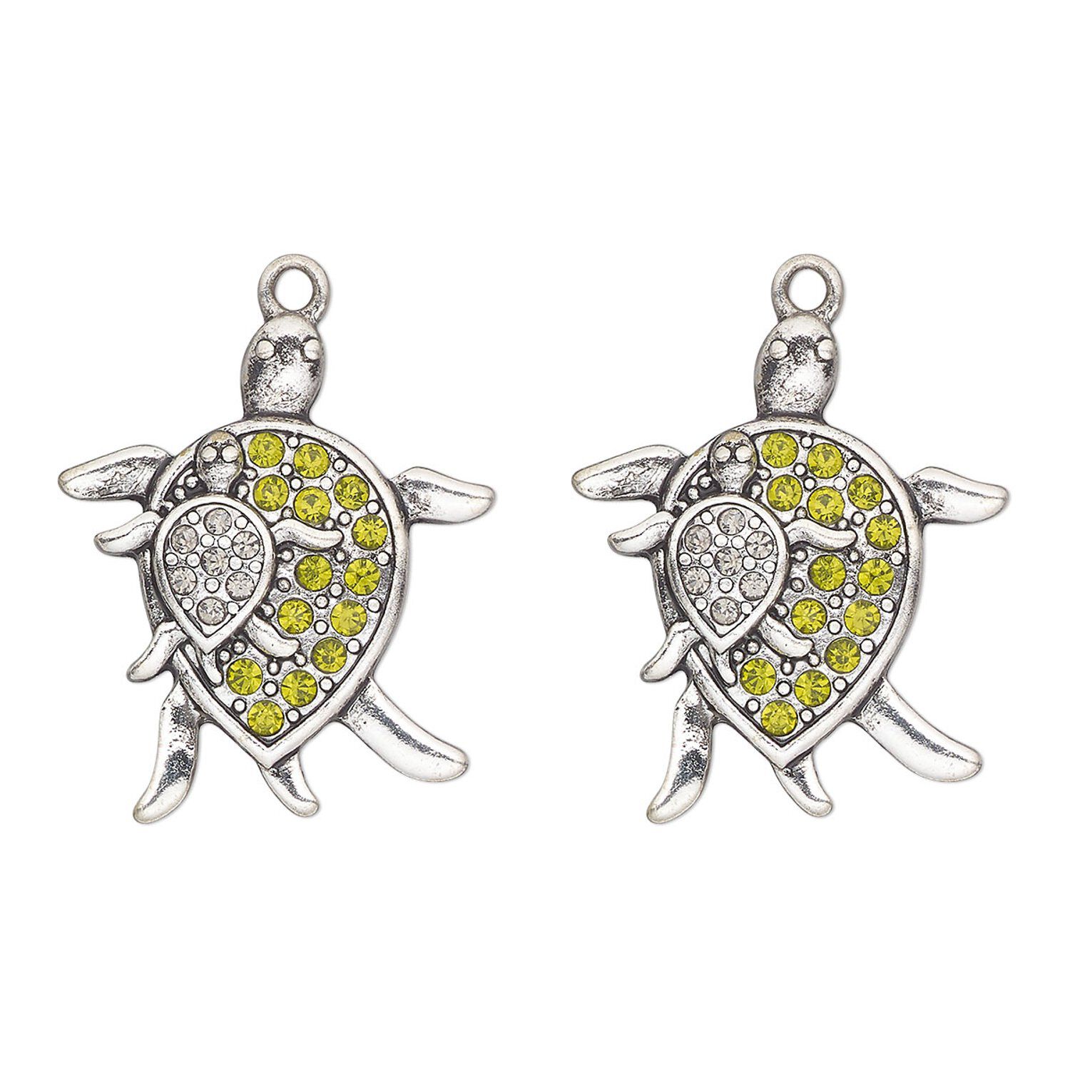 Charm, antique silver-finished "pewter" (zinc-based alloy) and glass, green and clear, 28x24mm single-sided sea turtle. Sold per pkg of 2.