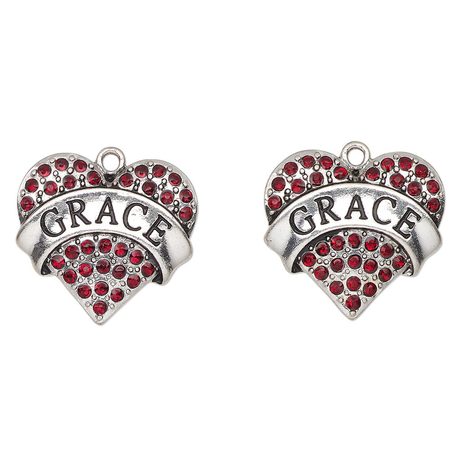 Charm, antique silver finish enamel "pewter" (zinc-based alloy) and glass, red and black, 24x23mm-25x23mm heart with "Grace". Sold per pkg of 2.