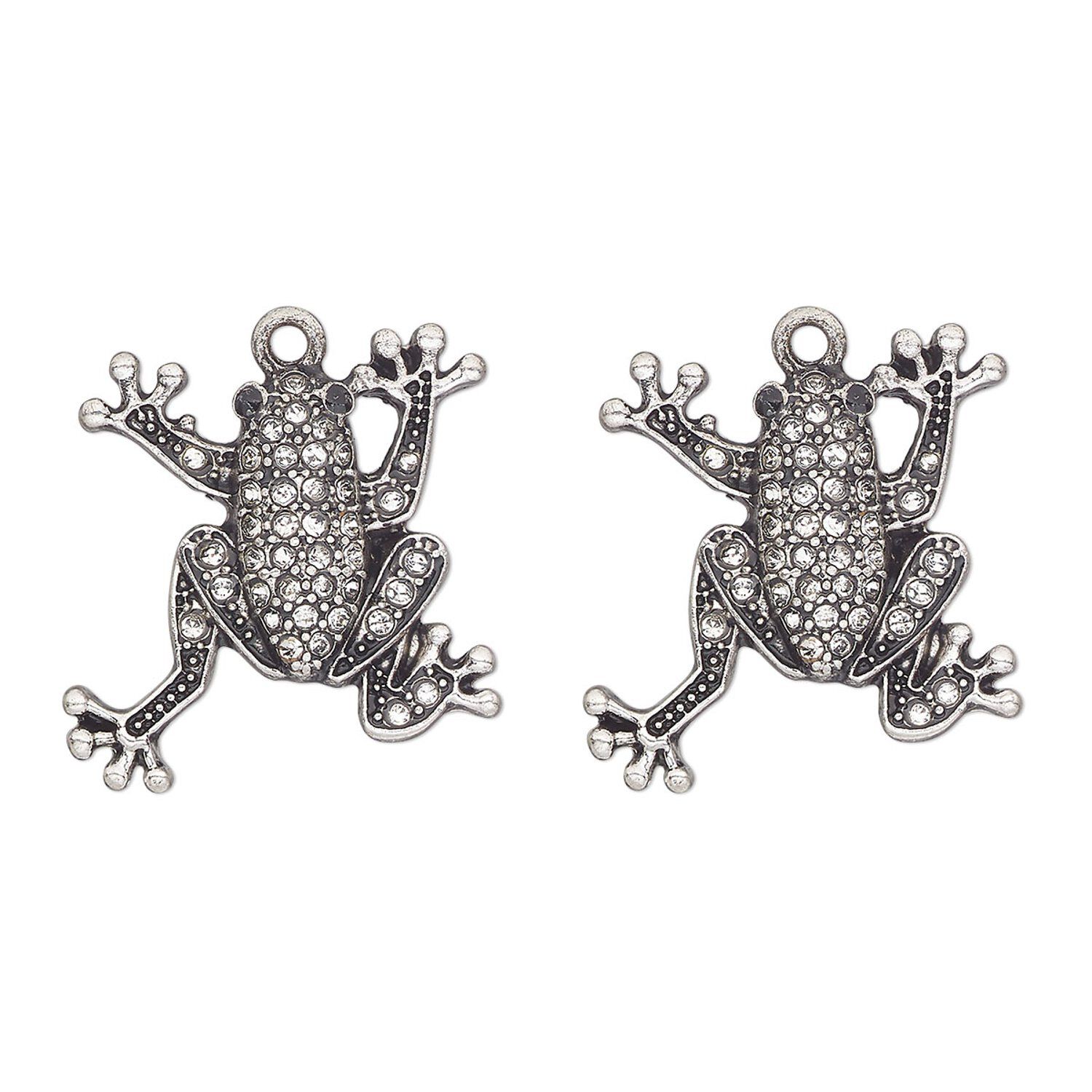 Charm, antique silver-finished "pewter" (zinc-based alloy) and glass, clear, 24x23mm single-sided frog. Sold per pkg of 2.