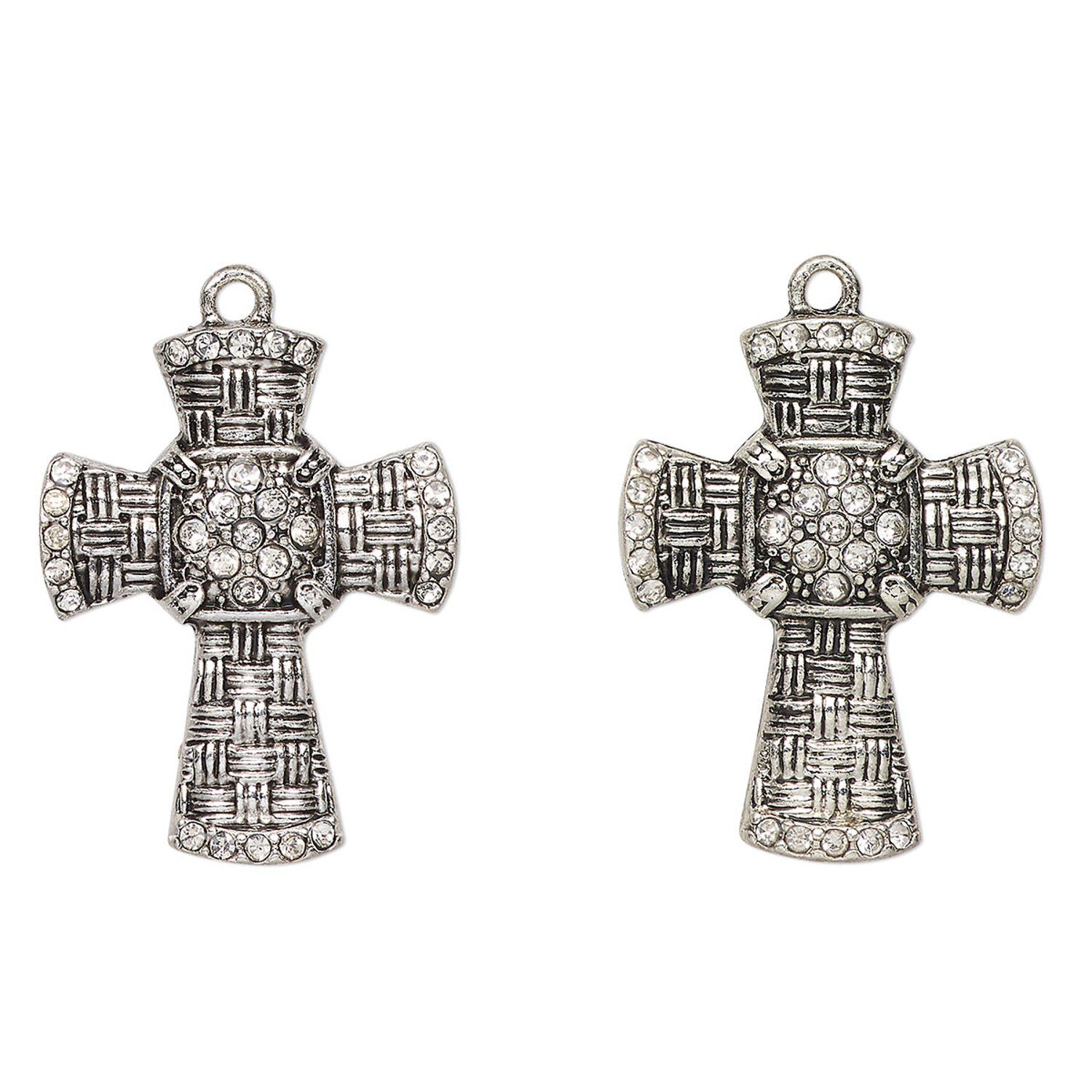 Focal, antique silver-finished "pewter" (zinc-based alloy) and glass, clear, 30x23mm weaved cross. Sold per pkg of 2.