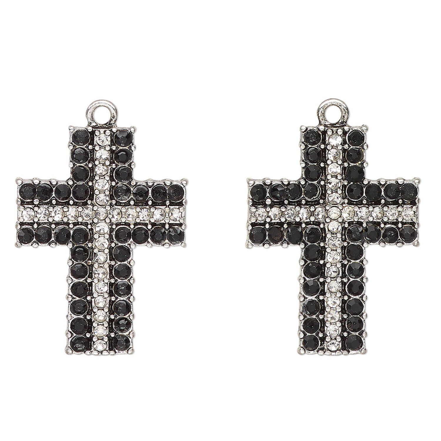Drop, antique silver-finished "pewter" (zinc-based alloy) and glass, clear and black, 29x21mm-29x22mm cross. Sold per pkg of 2.