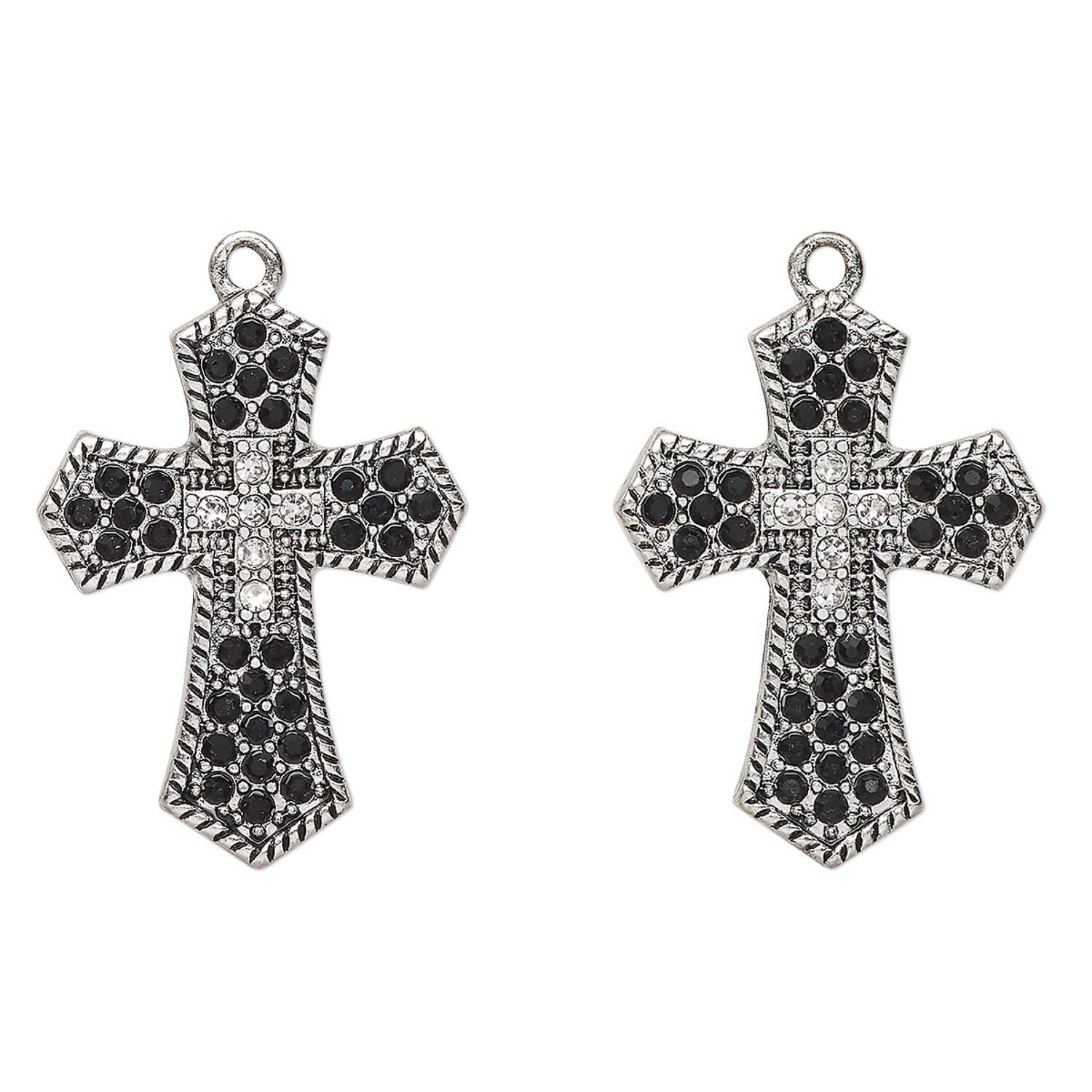 Drop, antique silver-finished "pewter" (zinc-based alloy) and glass, clear and black, 29x22mm cross. Sold per pkg of 2.