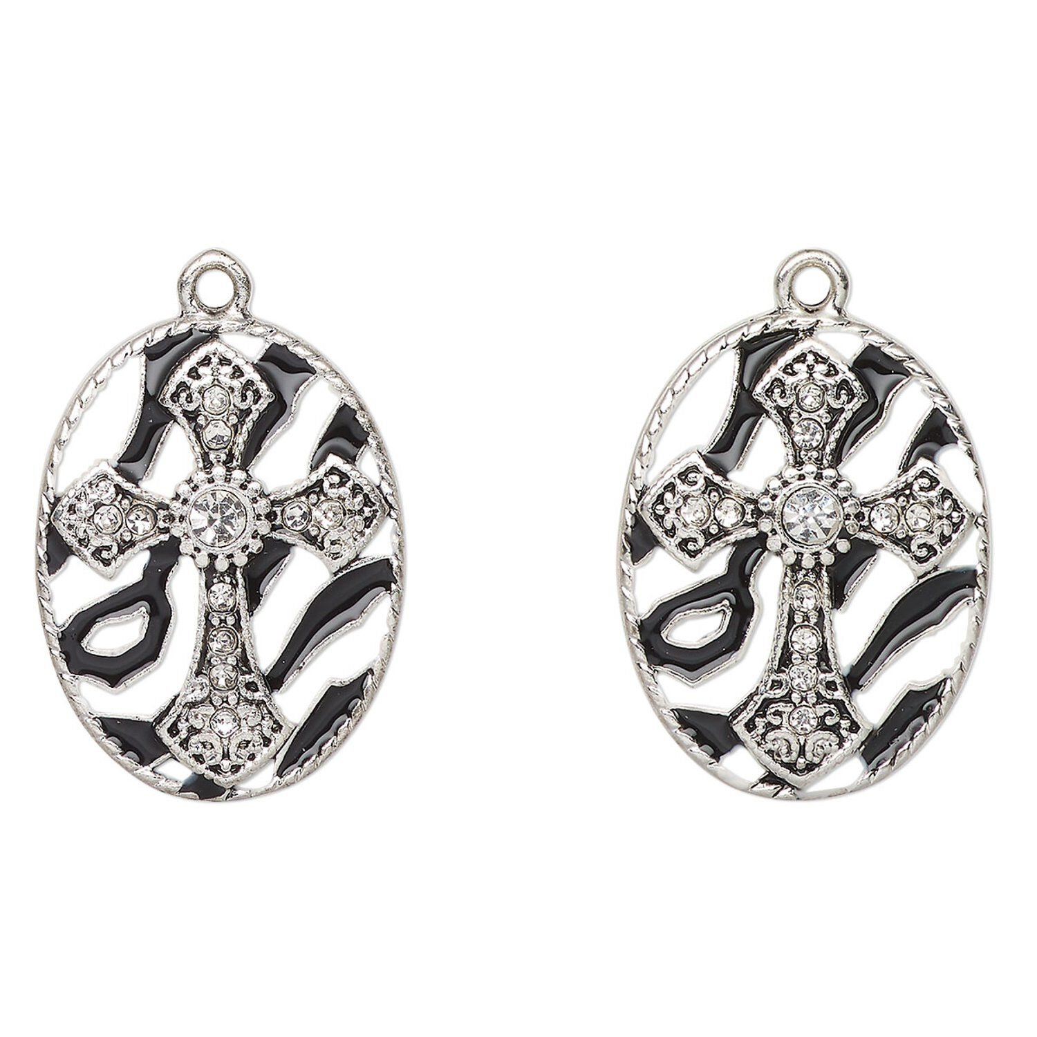 Drop, antique silver-finished enamel "pewter" (zinc-based alloy) and glass, clear / white / black, 26x20mm oval with cross and beaded edge. Sold per pkg of 2.