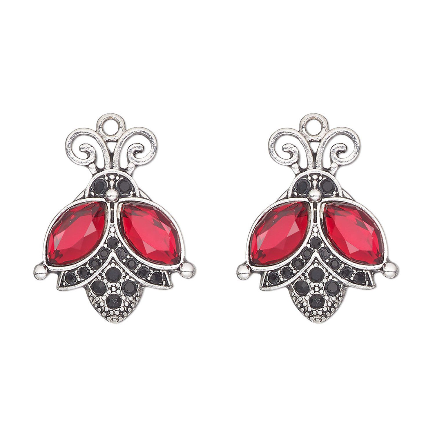 Charm, antique silver-finished "pewter" (zinc-based alloy) and glass, red / black / clear, 26x22mm single-sided ladybug. Sold per pkg of 2.