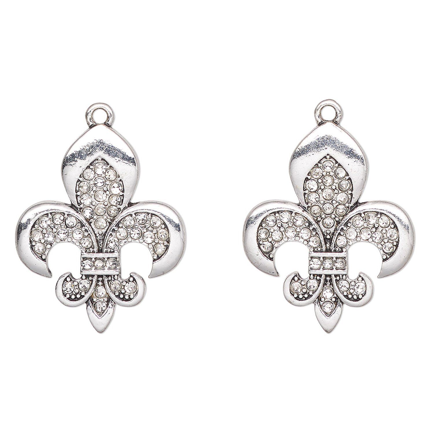 Focal, antique silver-finished "pewter" (zinc-based alloy) and glass, clear, 30x24mm fleur-de-lis. Sold per pkg of 2.