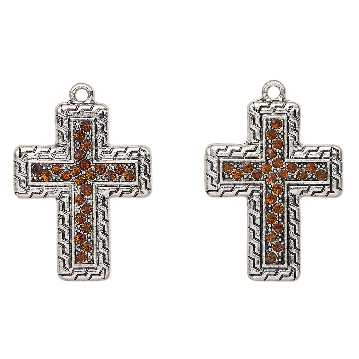 Focal, antique silver-finished "pewter" (zinc-based alloy) and glass, brown, 30x23mm cross. Sold per pkg of 2.