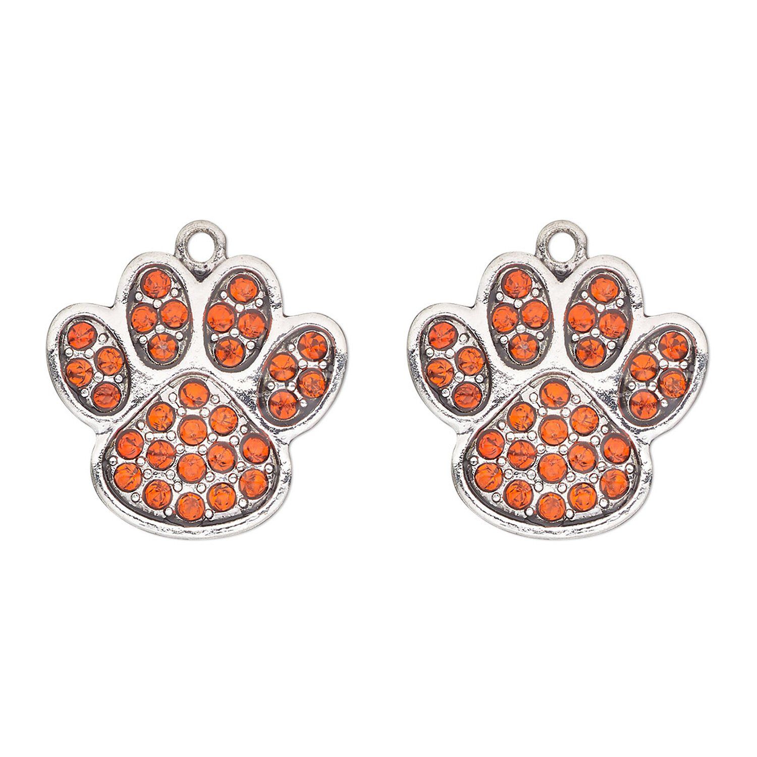 Charm, antique silver-finished "pewter" (zinc-based alloy) and glass, orange, 24x23mm single-sided paw print. Sold per pkg of 2.