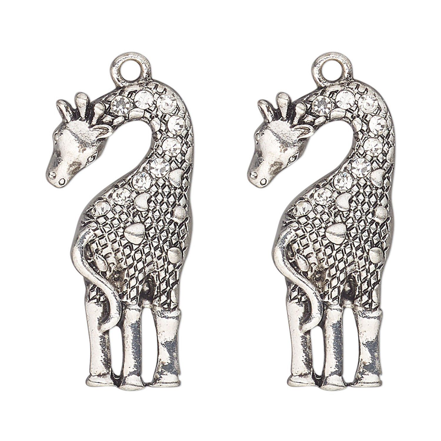 Focal, antique silver-finished "pewter" (zinc-based alloy) and glass, clear, 31x15mm single-sided giraffe. Sold per pkg of 2.