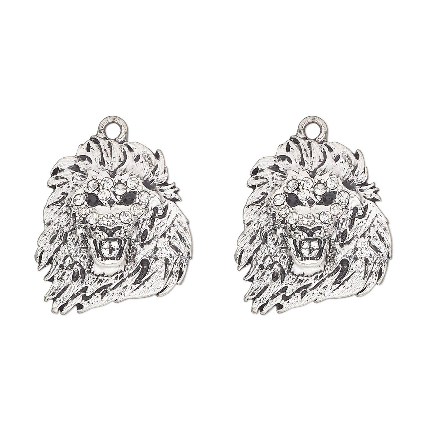 Charm, antique silver-finished "pewter" (zinc-based alloy) and glass, black, 23x22mm single-sided lion head. Sold per pkg of 2.