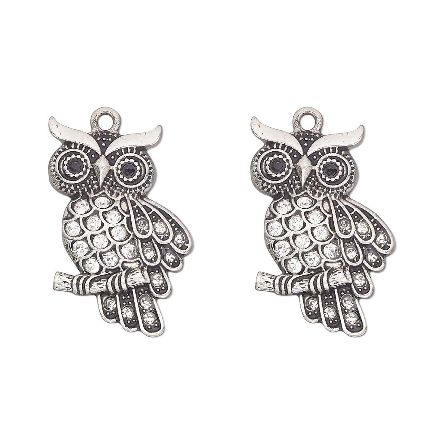 Charm, antique silver-finished "pewter" (zinc-based alloy), enamel and glass, clear and black, 28x19mm single-sided owl. Sold per pkg of 2.