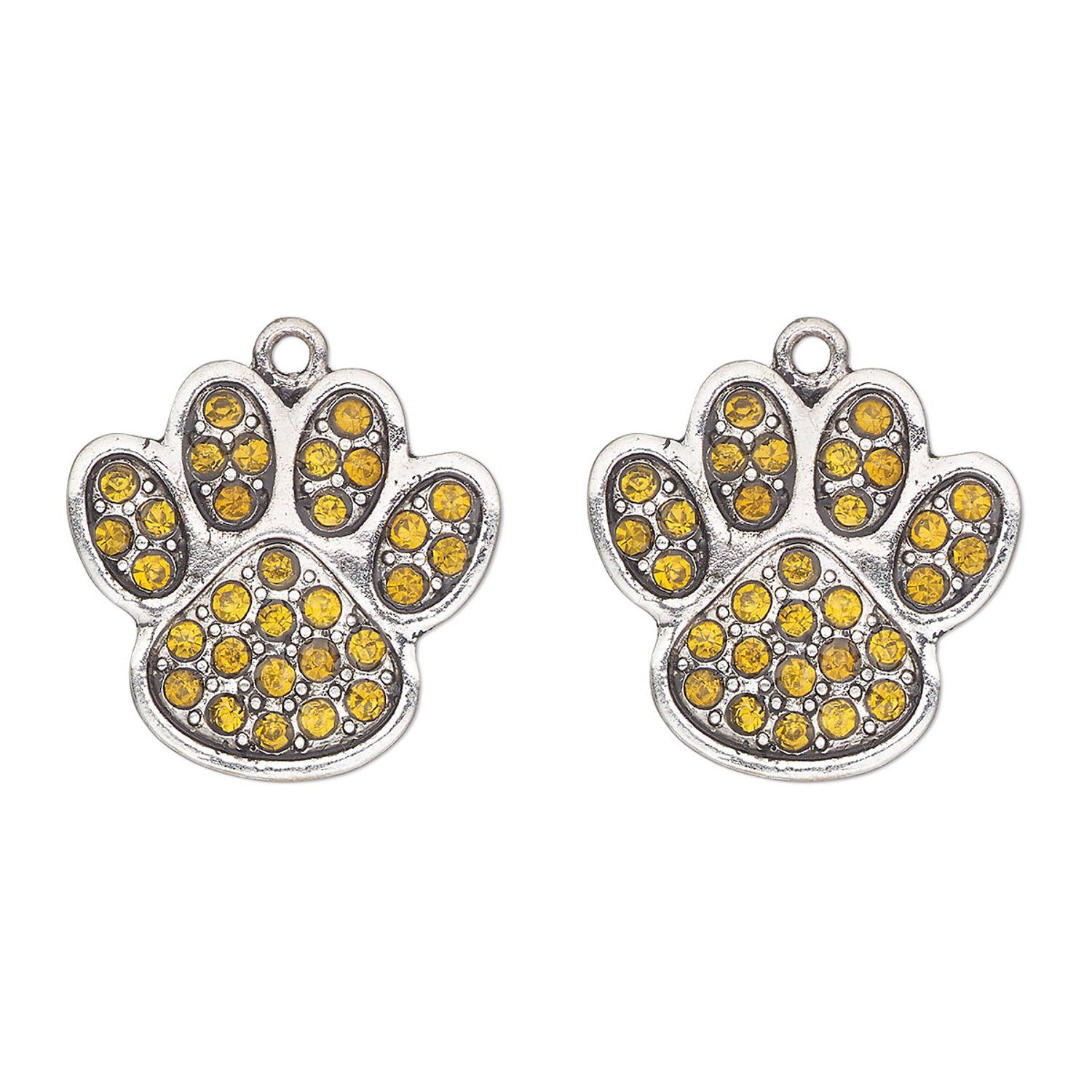 Charm, antique silver-finished "pewter" (zinc-based alloy) and glass, golden yellow, 24x23mm single-sided paw print. Sold per pkg of 2.