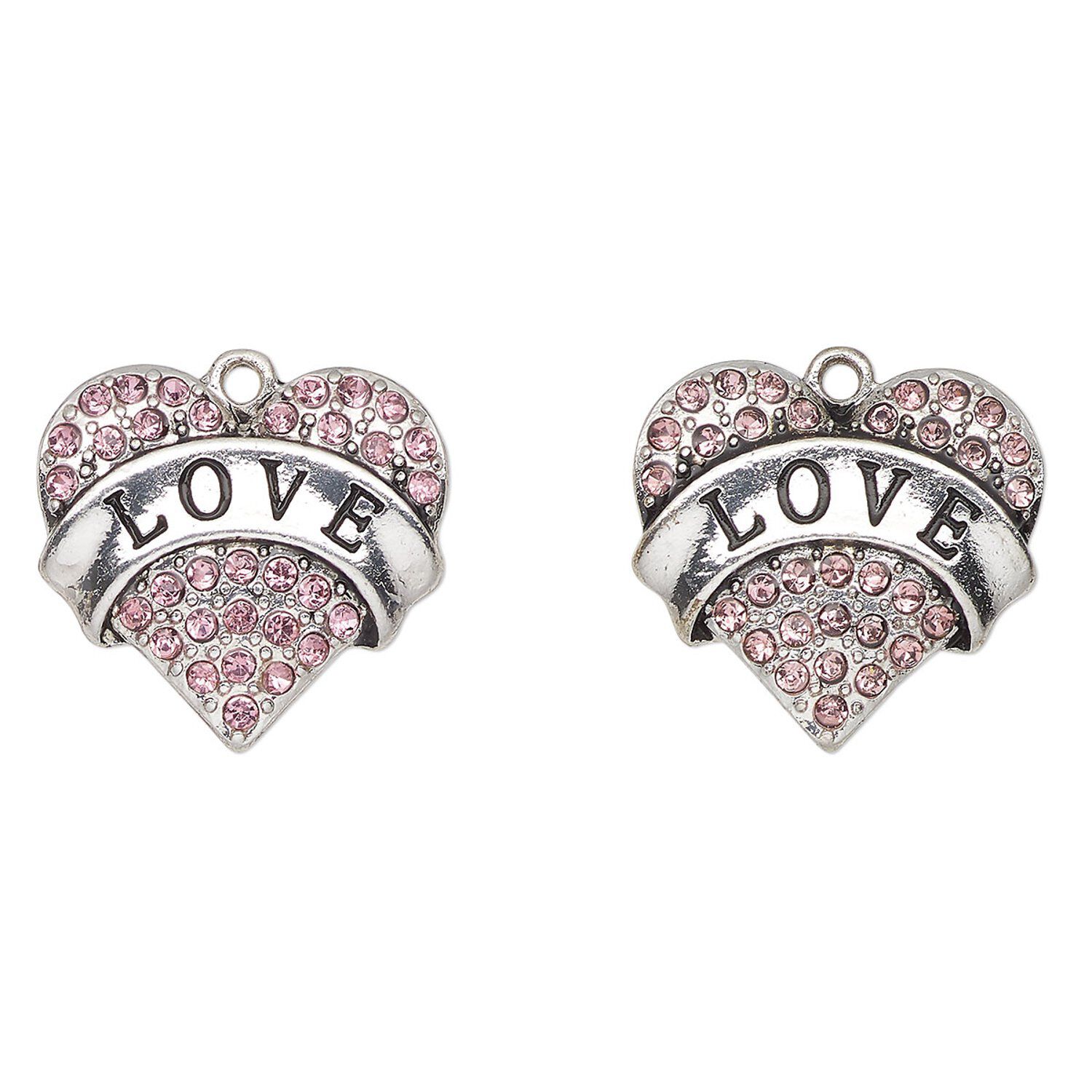 Charm, antique silver-finished enamel "pewter" (zinc-based alloy) and glass, pink and black, 24x23mm heart with "Love". Sold per pkg of 2.