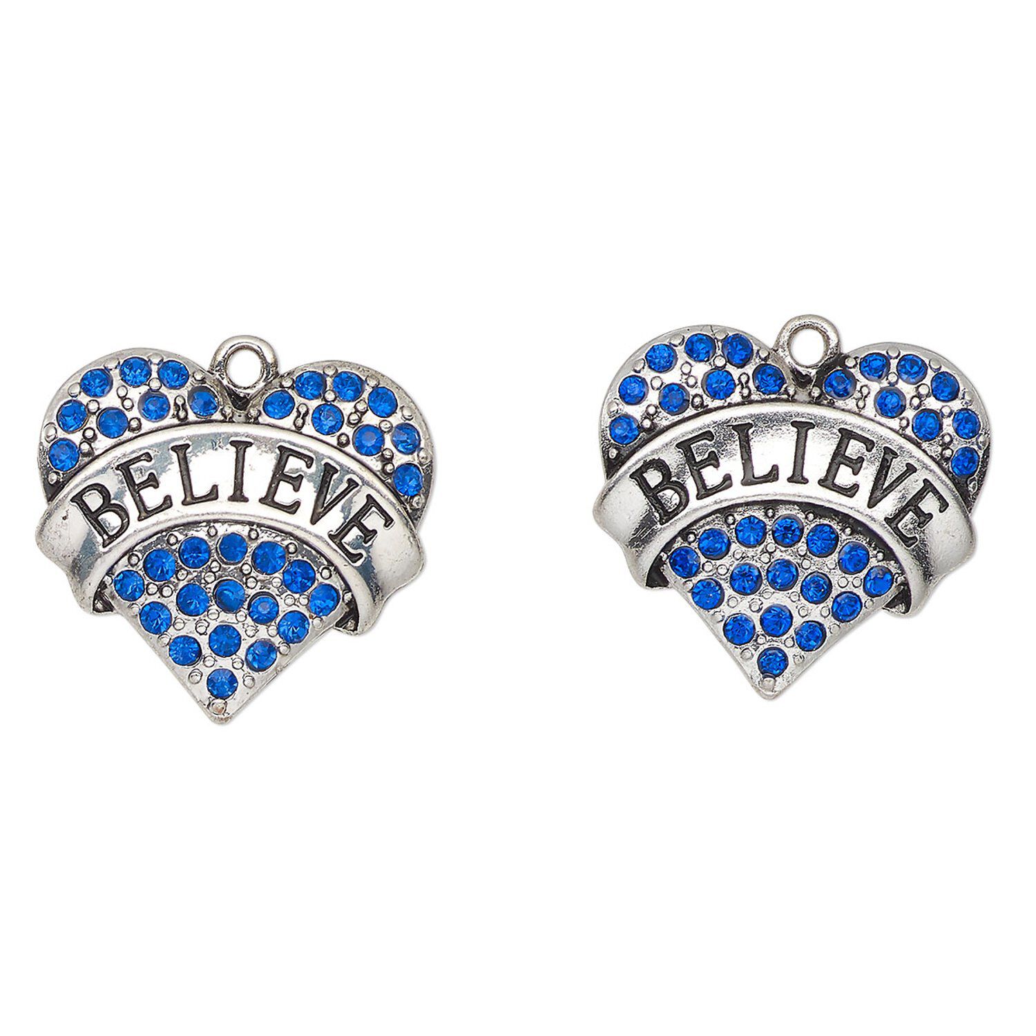 Charm, antique silver finish enamel "pewter" (zinc-based alloy) and glass, cobalt blue and black, 24x23mm heart with "Believe". Sold per pkg of 2.
