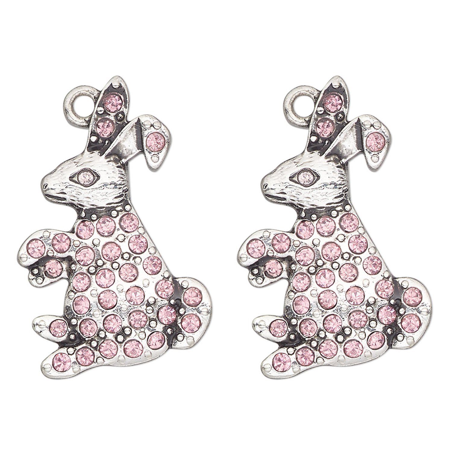 Charm, antique silver-finished "pewter" (zinc-based alloy) and glass, pink, 26x19mm single-sided rabbit. Sold per pkg of 2.