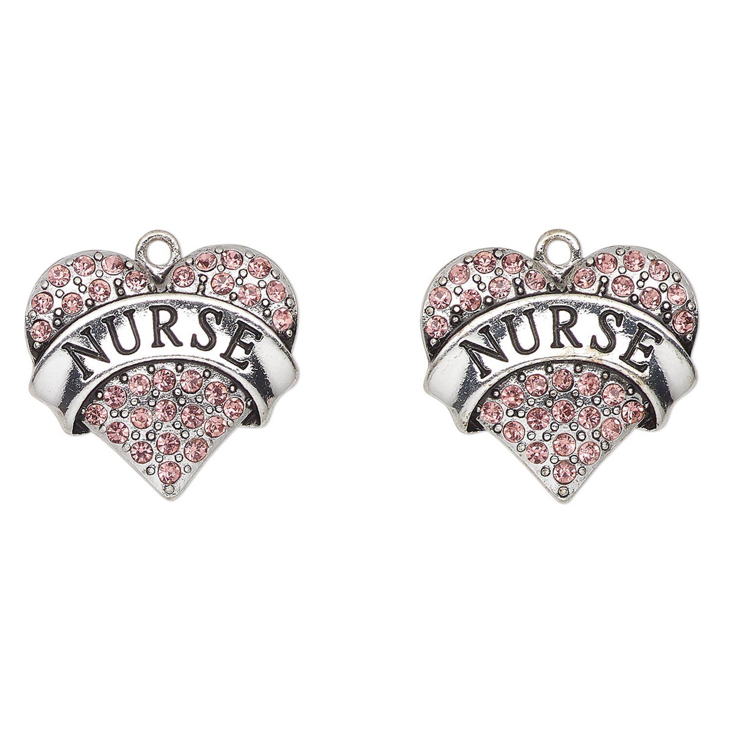 Charm, antique silver-finished enamel "pewter" (zinc-based alloy) and glass, pink and black, 24x23mm heart with "Nurse". Sold per pkg of 2.