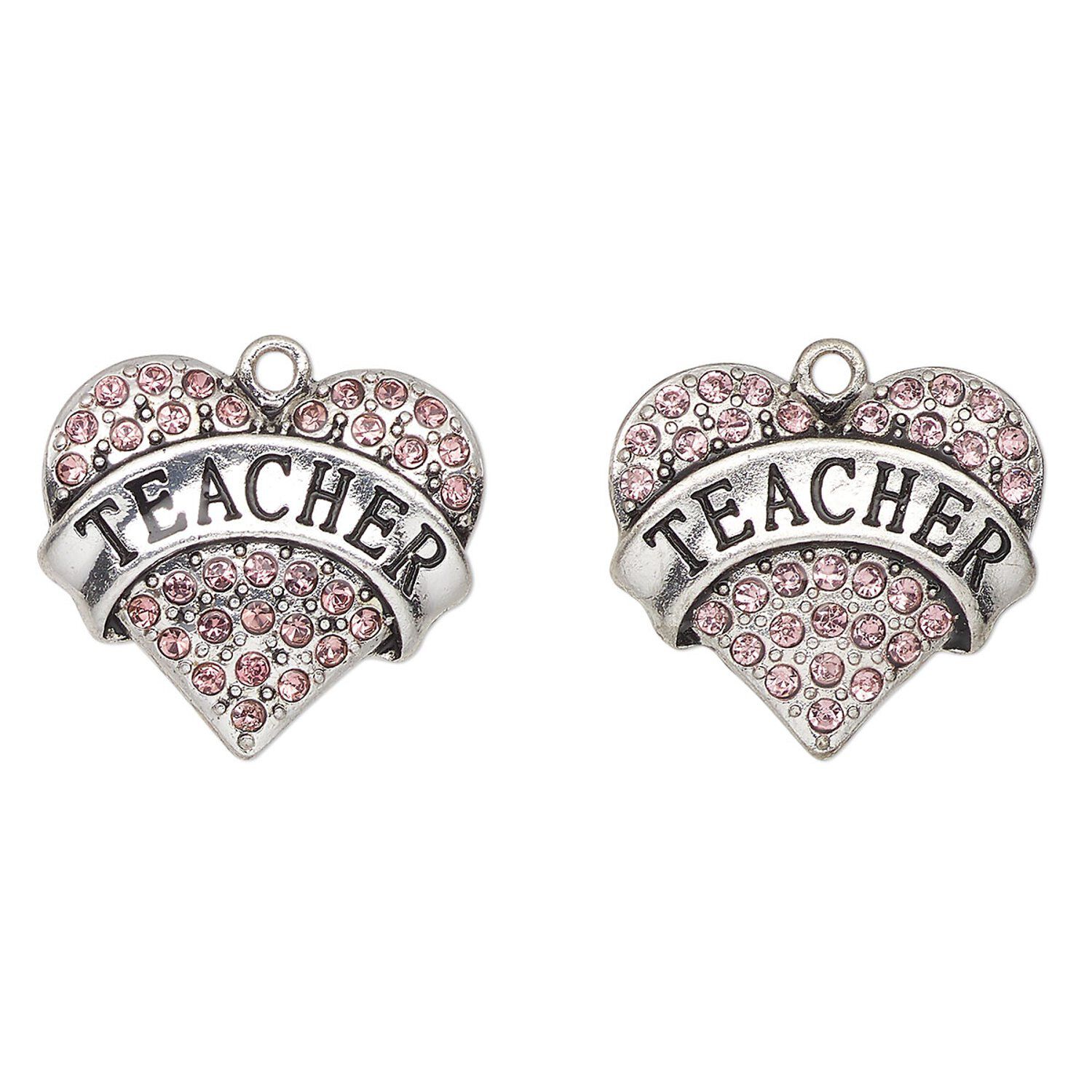 Charm, antique silver-finished enamel "pewter" (zinc-based alloy) and glass, pink and black, 24x23mm heart with "Teacher". Sold per pkg of 2.