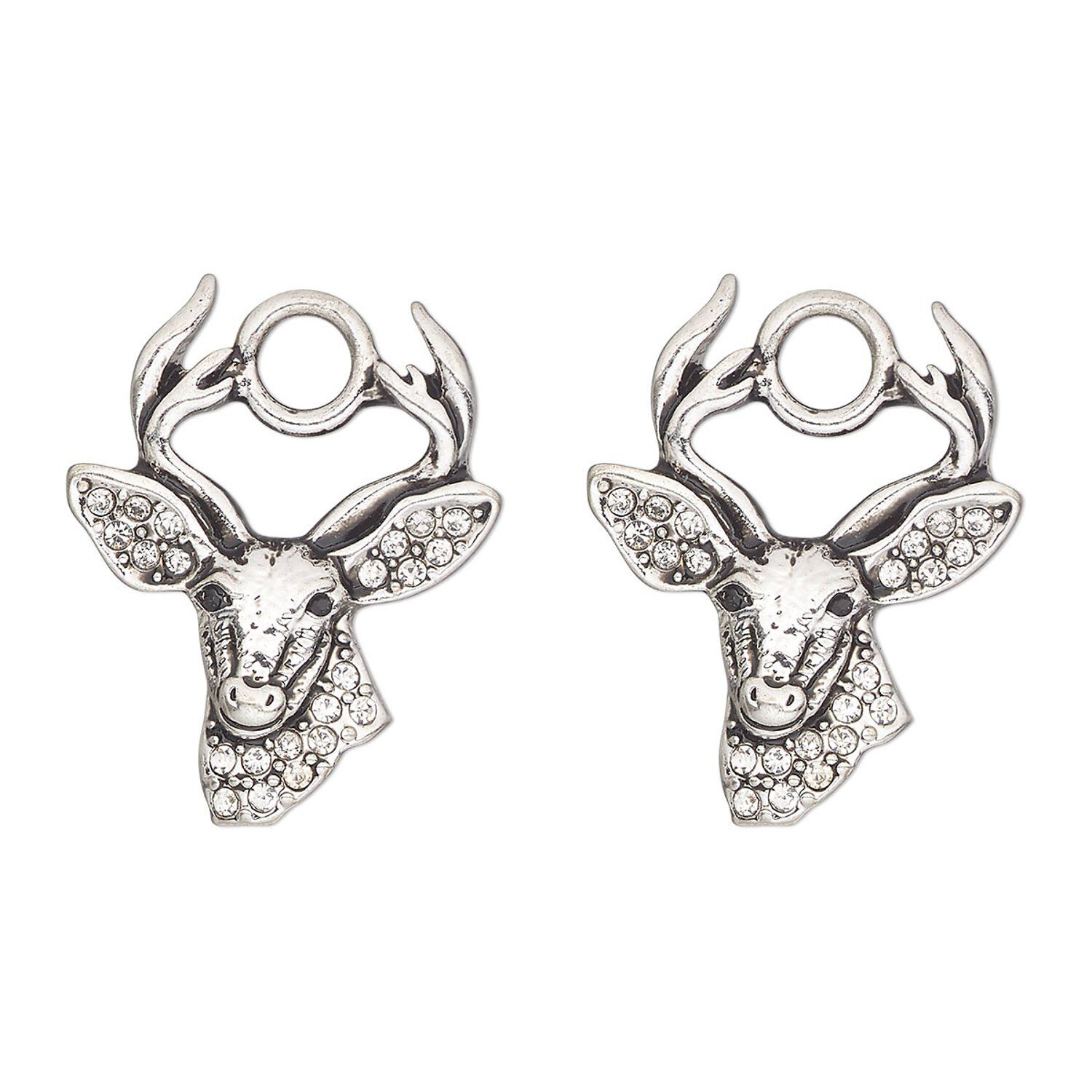 Charm, antique silver-finished "pewter" (zinc-based alloy) and glass, clear and black, 24x23mm single-sided deer head. Sold per pkg of 2.
