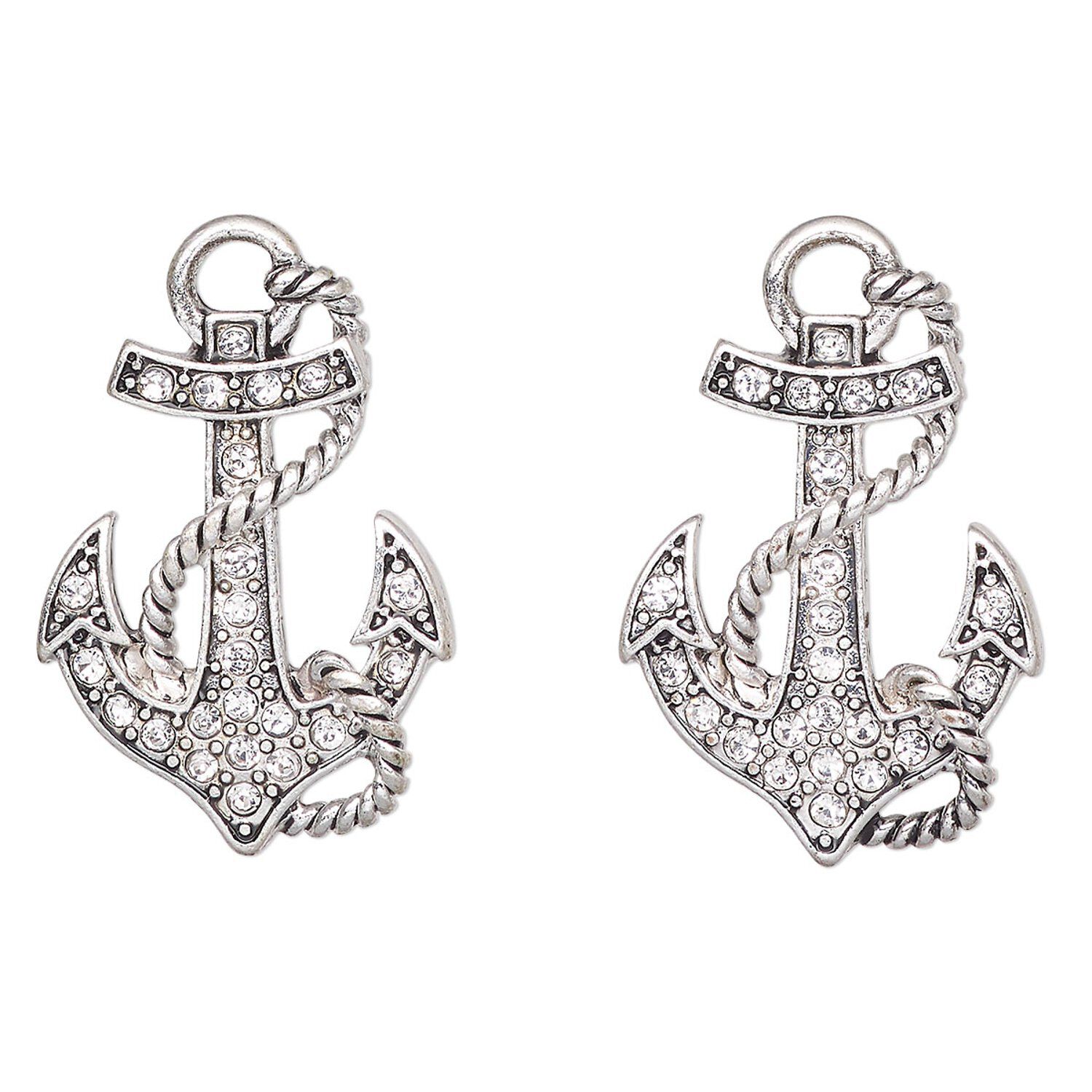 Charm, antique silver-finished "pewter" (zinc-based alloy) and glass, clear, 25x20mm anchor. Sold per pkg of 2.