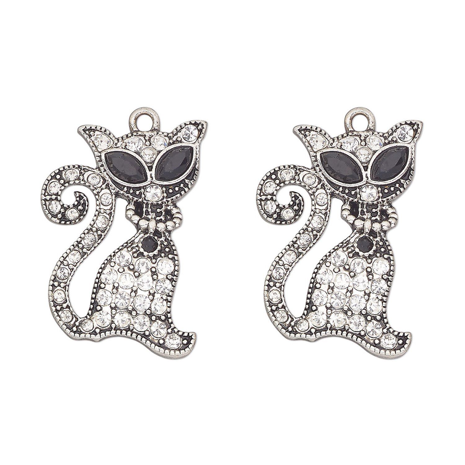 Charm, antique silver-finished "pewter" (zinc-based alloy) and glass, clear and black, 29x20mm single-sided cat. Sold per pkg of 2.