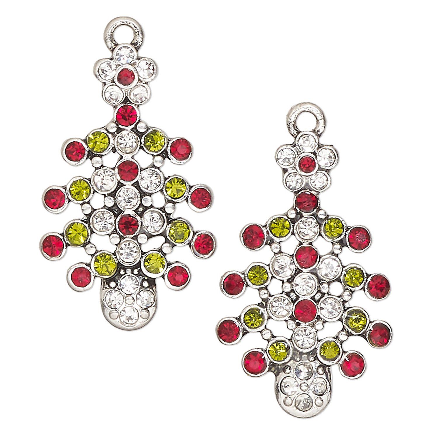 Focal, antique silver-finished "pewter" (zinc-based alloy) and glass, red / green / clear, 30x19mm Christmas tree. Sold per pkg of 2.