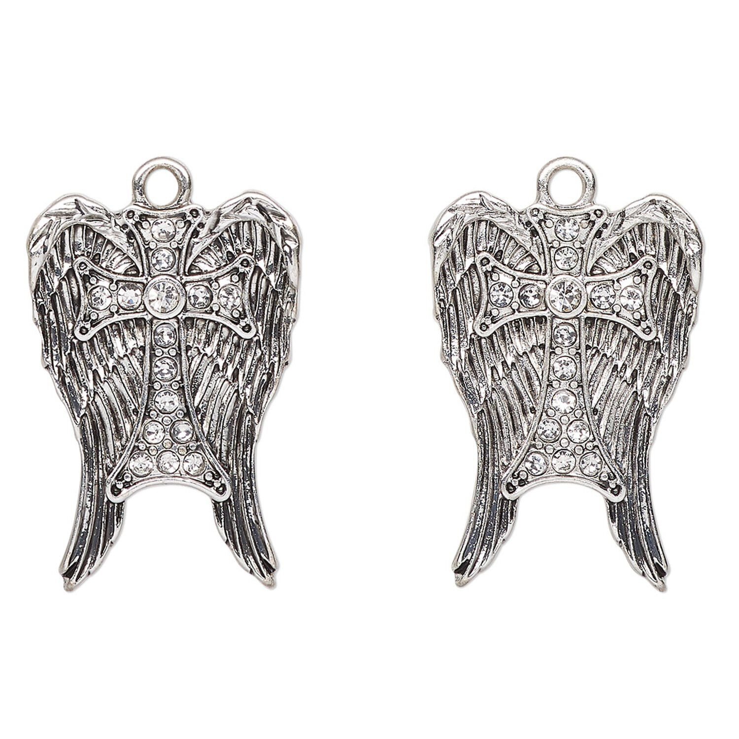 Drop, antique silver-finished "pewter" (zinc-based alloy), 27x18mm angel wings with cross. Sold per pkg of 2.