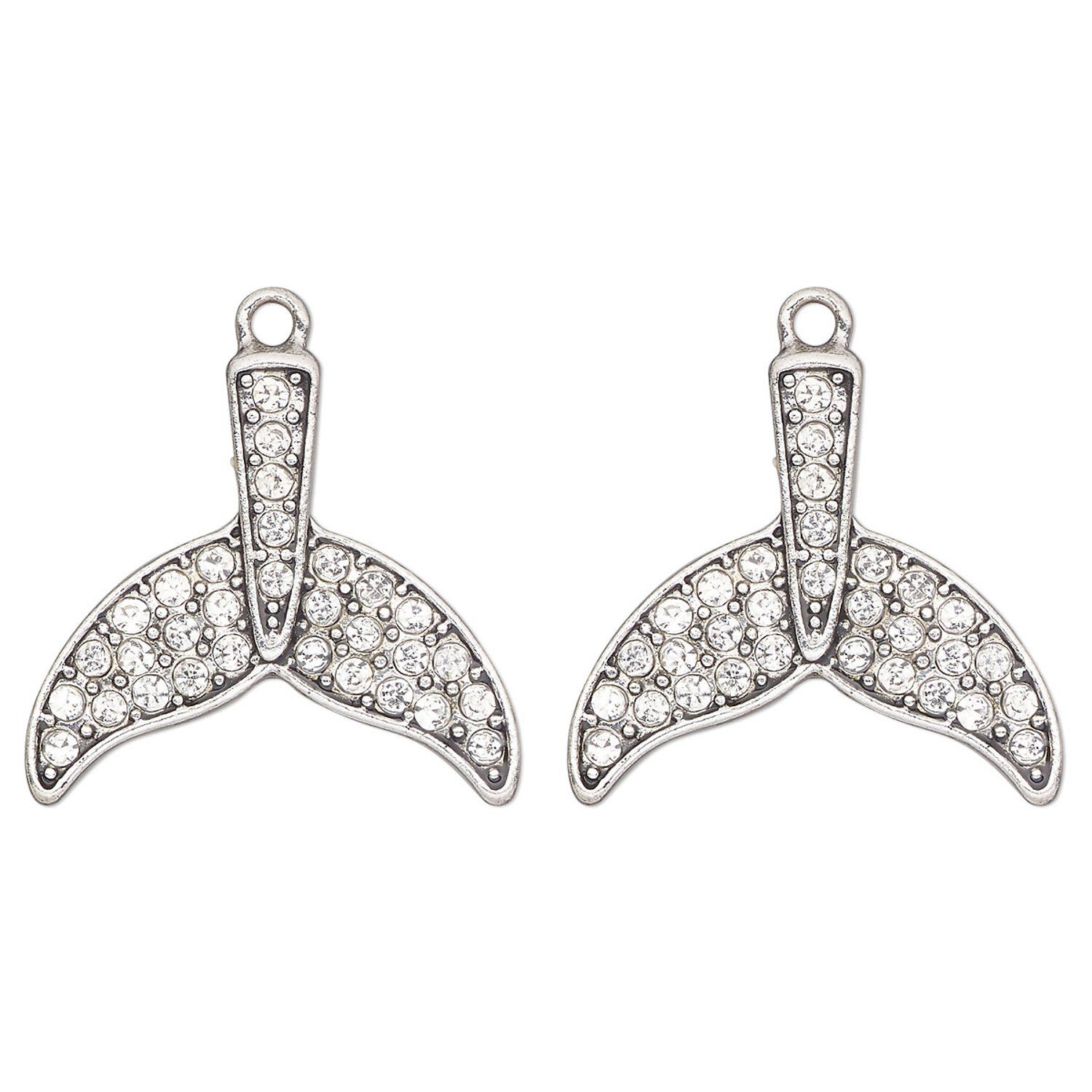 Charm, antique silver-finished "pewter" (zinc-based alloy) and glass, clear, 27x25mm single-sided whale tail. Sold per pkg of 2.