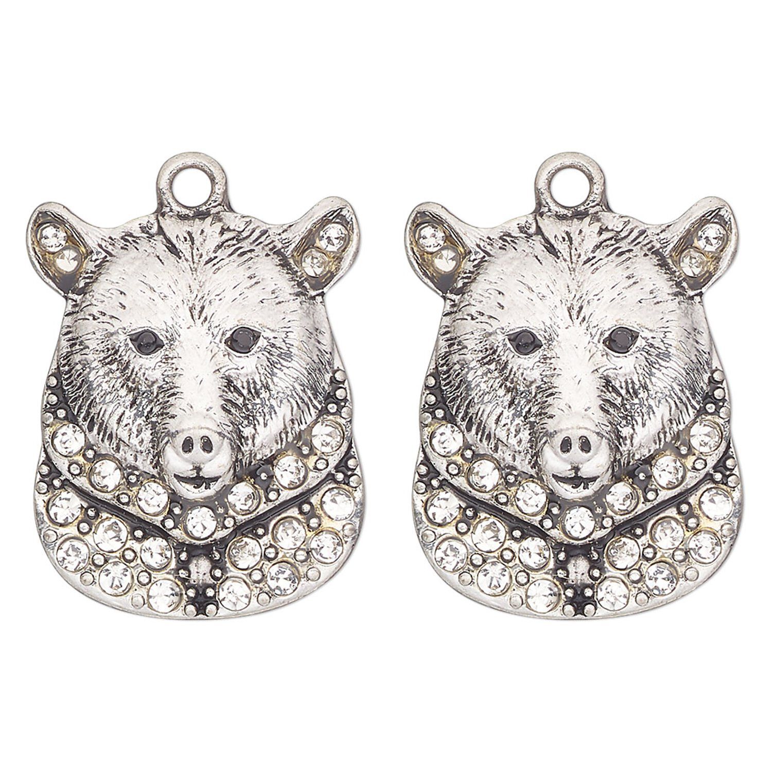 Charm, antique silver-finished "pewter" (zinc-based alloy) and glass, clear and black, 24x19mm single-sided bear head. Sold per pkg of 2.