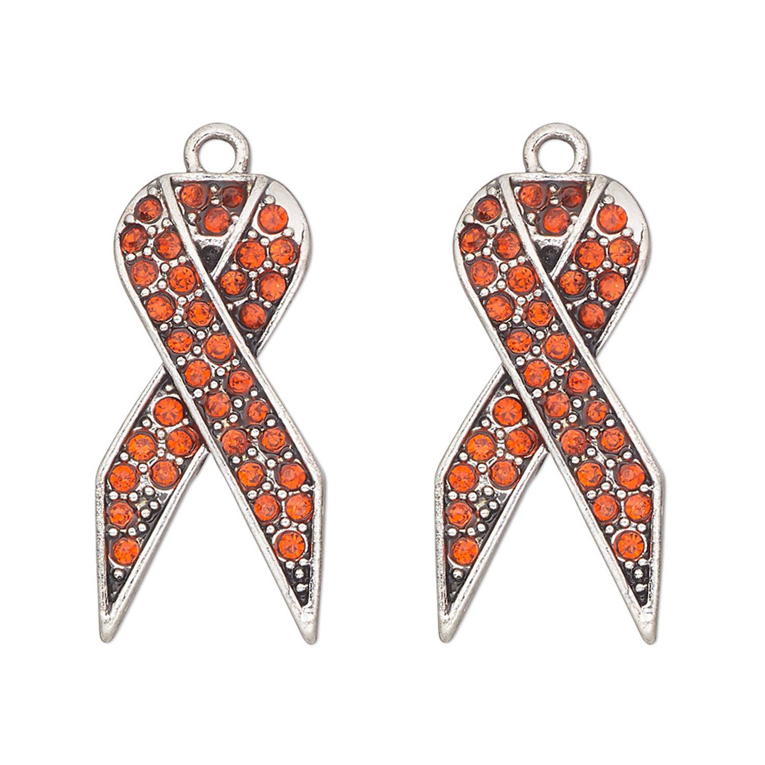 Charm, antique silver-finished "pewter" (zinc-based alloy) and glass, orange, 27x13mm single-sided awareness ribbon. Sold per pkg of 2.