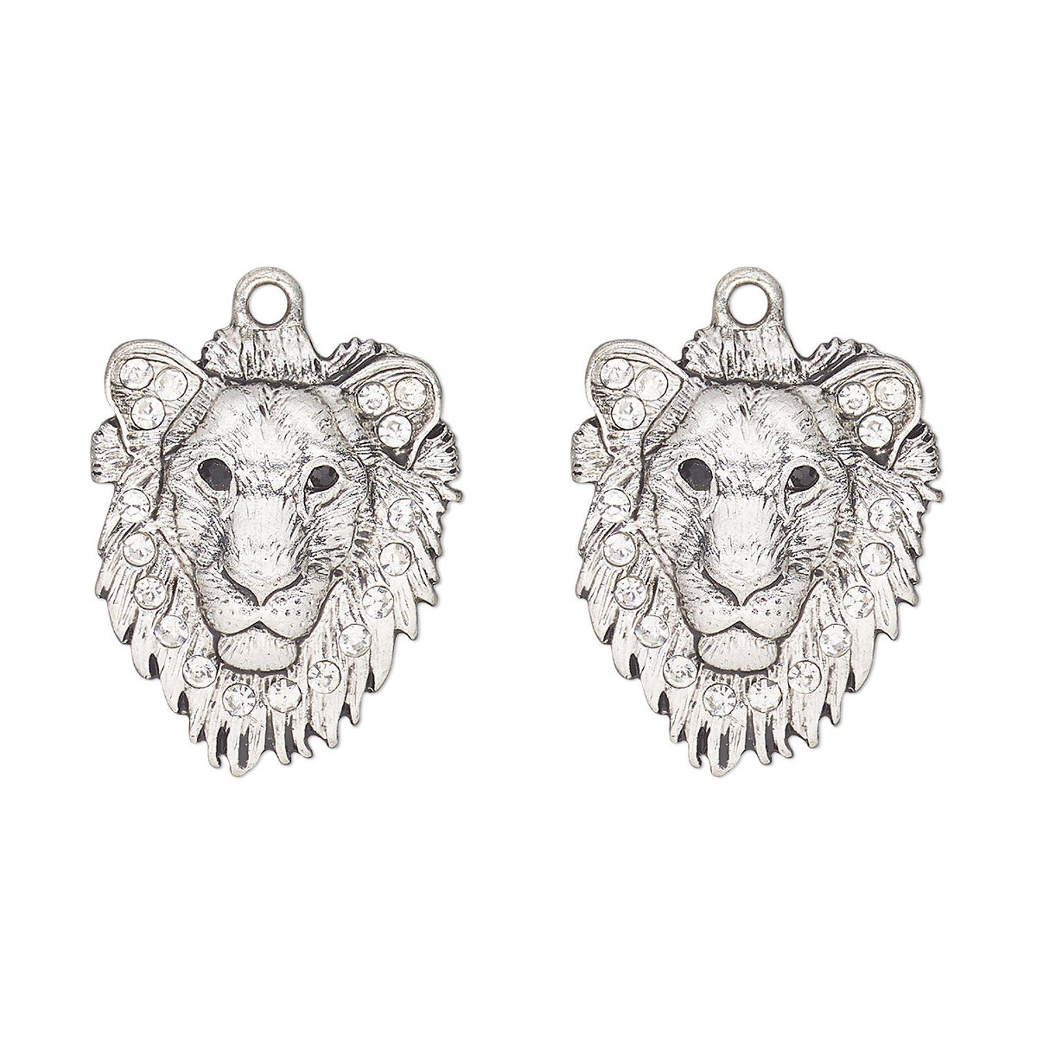 Charm, antique silver-finished "pewter" (zinc-based alloy) and glass, clear and black, 26x22mm single-sided lion head. Sold per pkg of 2.